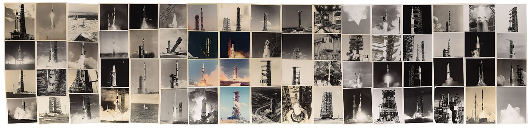 Impressive vintage collection of over 100 early NASA photographs documenting the development and testing of the program’s flagship rocket and missiles launching systems from throughout the 1960s and 1970s. The majority of the photos are glossy black-and-white, with some color and matte-finish, 8 x 10 and 10 x 8, with the greater part of the photos bearing purple caption text on reverse, some notably faded, and others with “A Kodak Paper” watermarks. Images include (some duplicates): dramatic shots of fiery rocket launches for the Saturn 1-B, SA-8, Centaur V, the Atlas-D Antares-2, and Apollo missions 15 and 17, to name but a few; unique glimpses of the interior of the Vehicle Assembly Building, with photos of capsules and staging, such as the S-IV and S-IVB; images of the mobile service structure, including the Launch Umbilical Tower and Crawler-transporter during rollout; various aerial and ground-level perspectives of Launch Complex 39 at the Kennedy Space Center; and NASA personnel and engineers hard at work. In overall fine condition, with some curling to photos, and occasional instances of edgewear.