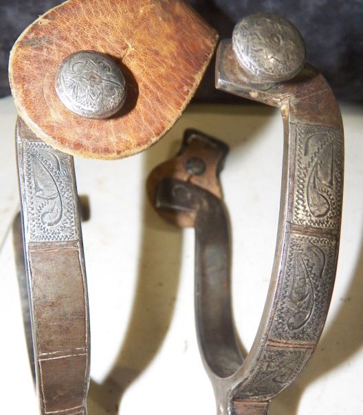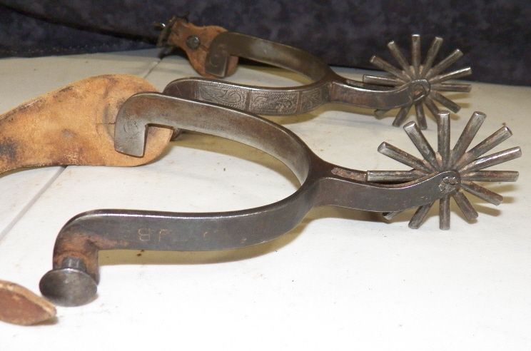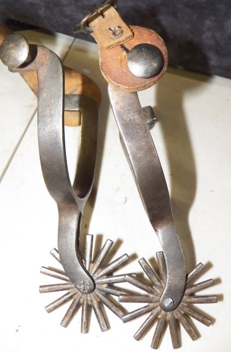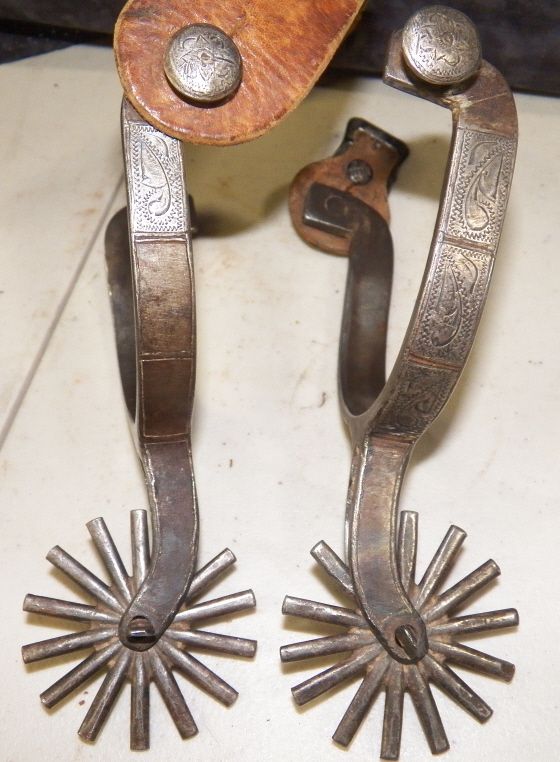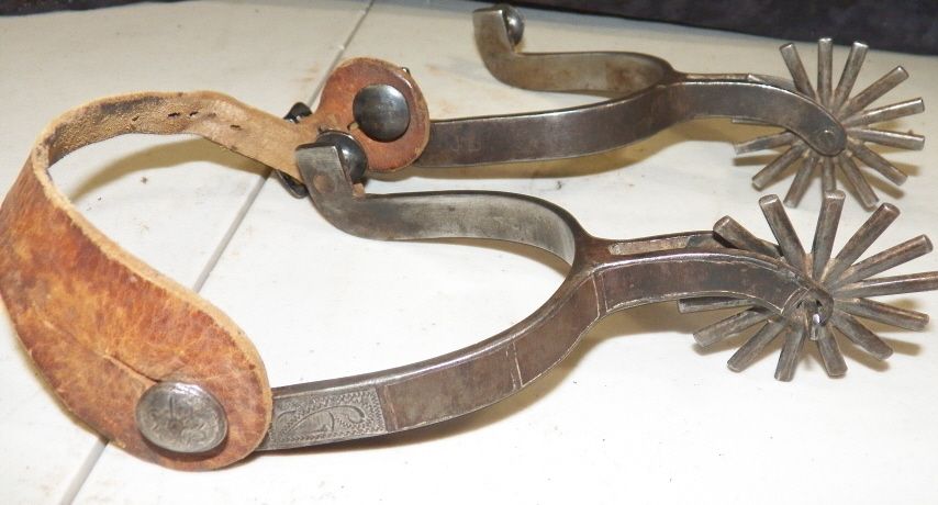 Single Mounted with some silver missing but very nice pair of large rowel spurs. 2 3/8"- 14 Point Rowels overall length 7 1/8" heelband opening 3 1/2"