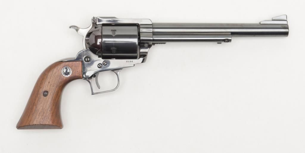 Early Ruger Blackhawk, .44 Magnum single action revolver with 7 ½” barrel showing high polish blue finish and wood medallion grips, serial number 6664. The revolver shows 95%-98% bright original blue with a slight index line on the cylinder andminor handling and use. Micro marked rear sight. Great action, fine bore and no transfer bar added. Collector’s quality. Est.: $500-$1000