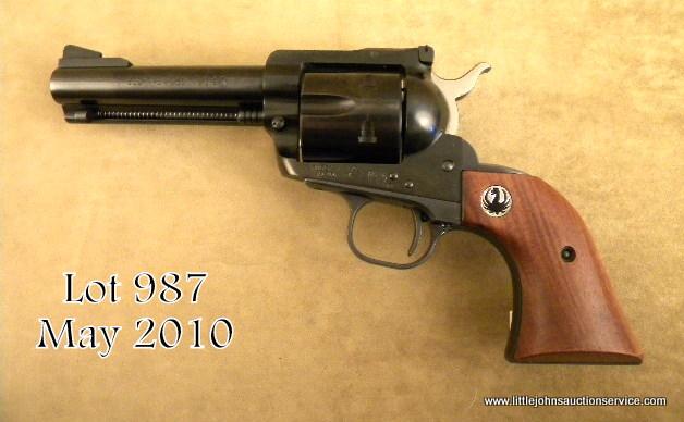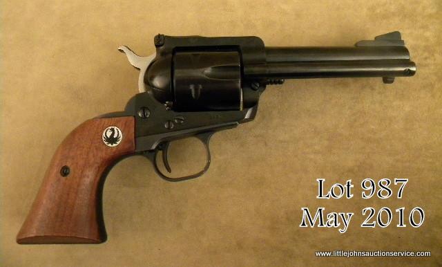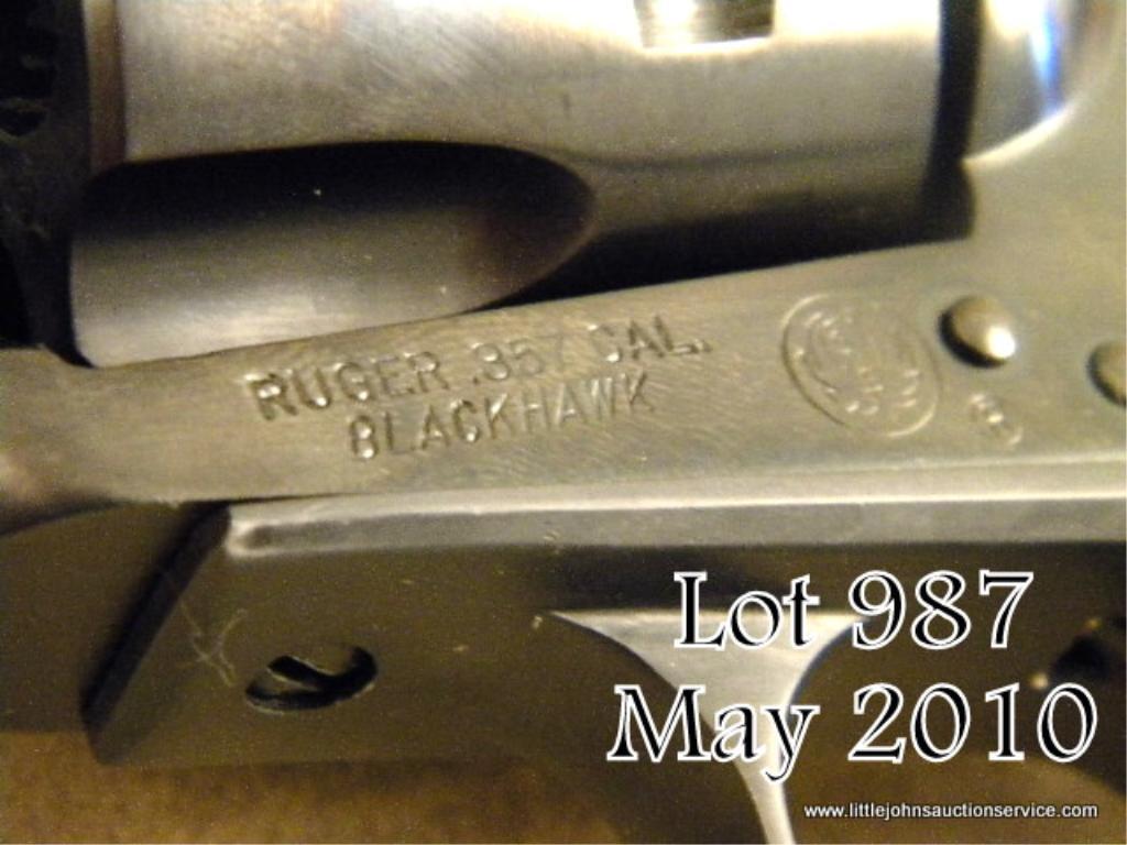 Early Ruger Blackhawk SAA revolver, .357 Magnum cal., 4-1/2” barrel, black finish, smooth Ruger medallion wood grips, #42980. This gun is in overall excellent condition showing little handling or firing with approx. 99% originalfinish, excellent bore, crisp action, excellent grips with original yellow, red and black factory two piece box, wax paper and instructions. Est.: $300-$400.
