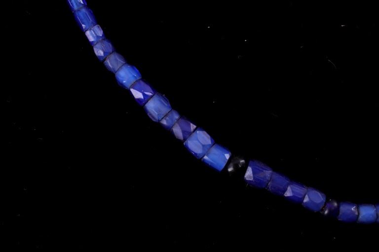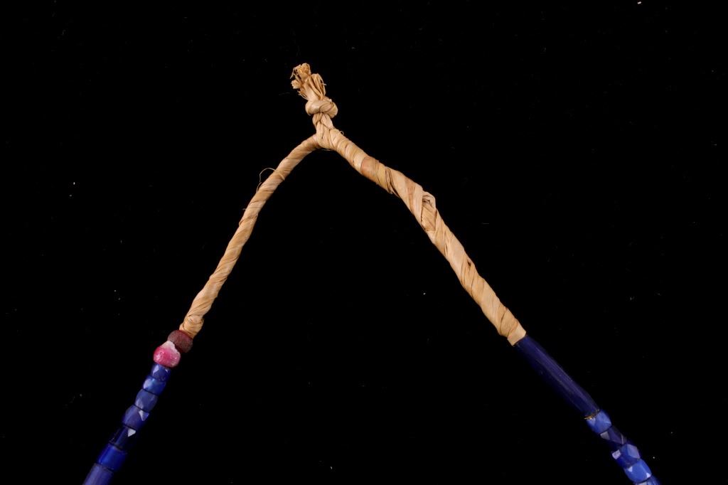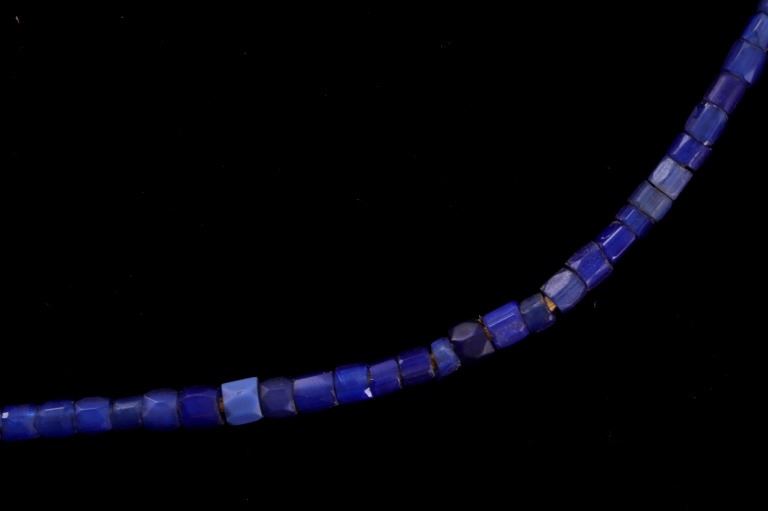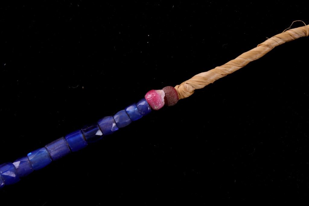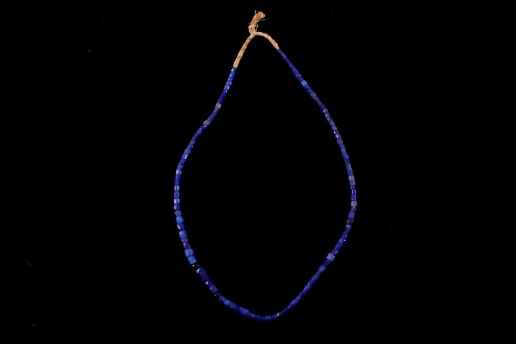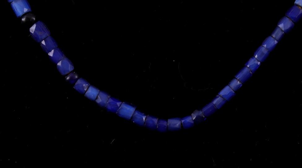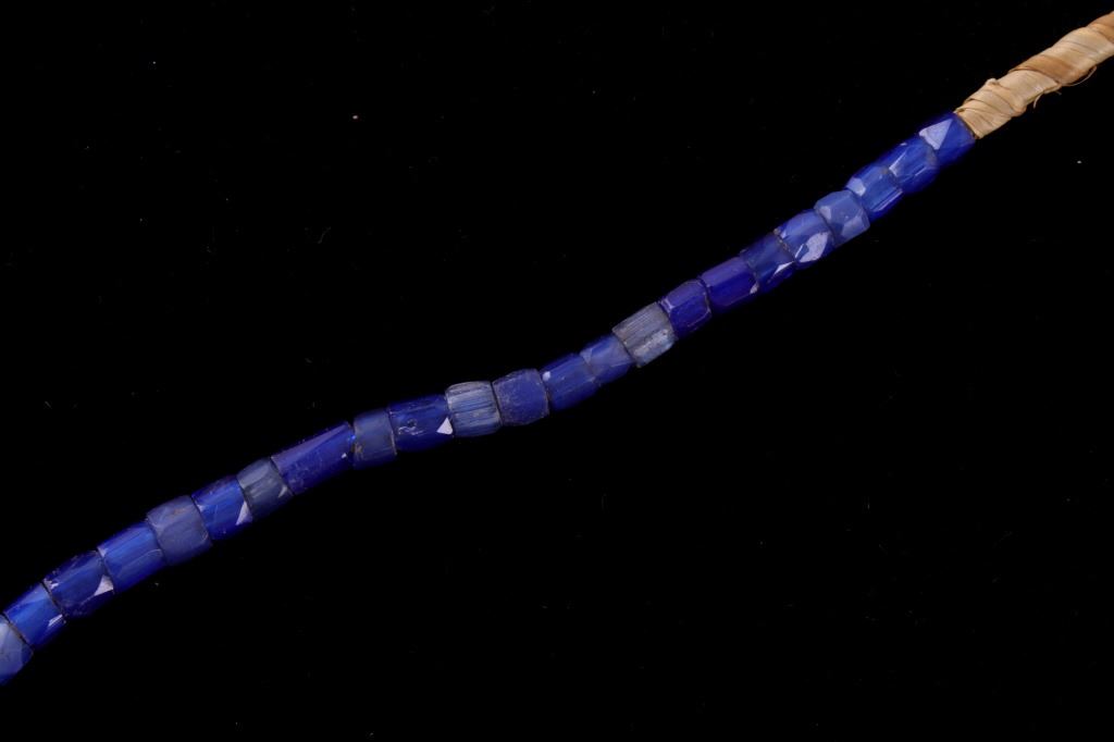 For your consideration are two cobalt blue Russian trade glass bead strands, circa 1800s. These beautiful blue pieces show a faceted, tubular, round, and ball glass trade bead originally traded by the Russians to the Alaska Natives in exchange for Sea Otter pelts, carvings, and other items. The beads were a desirable form of currency. These two necklaces are strung on separate strands of raffia grass. The larger strand shows a smaller diameter bead towards the top and 111 beads overall. The smaller strand displays 86 beads, two beads are red and one is green. Six of the beads are tubular. Overall, these beads show good condition, with a few showing signs of wear, including small chips due to age. The larger beads measure 3/4" in length and the smaller beads 1/8" to 1/4". The necklaces are approximately 24" and 23" in length.