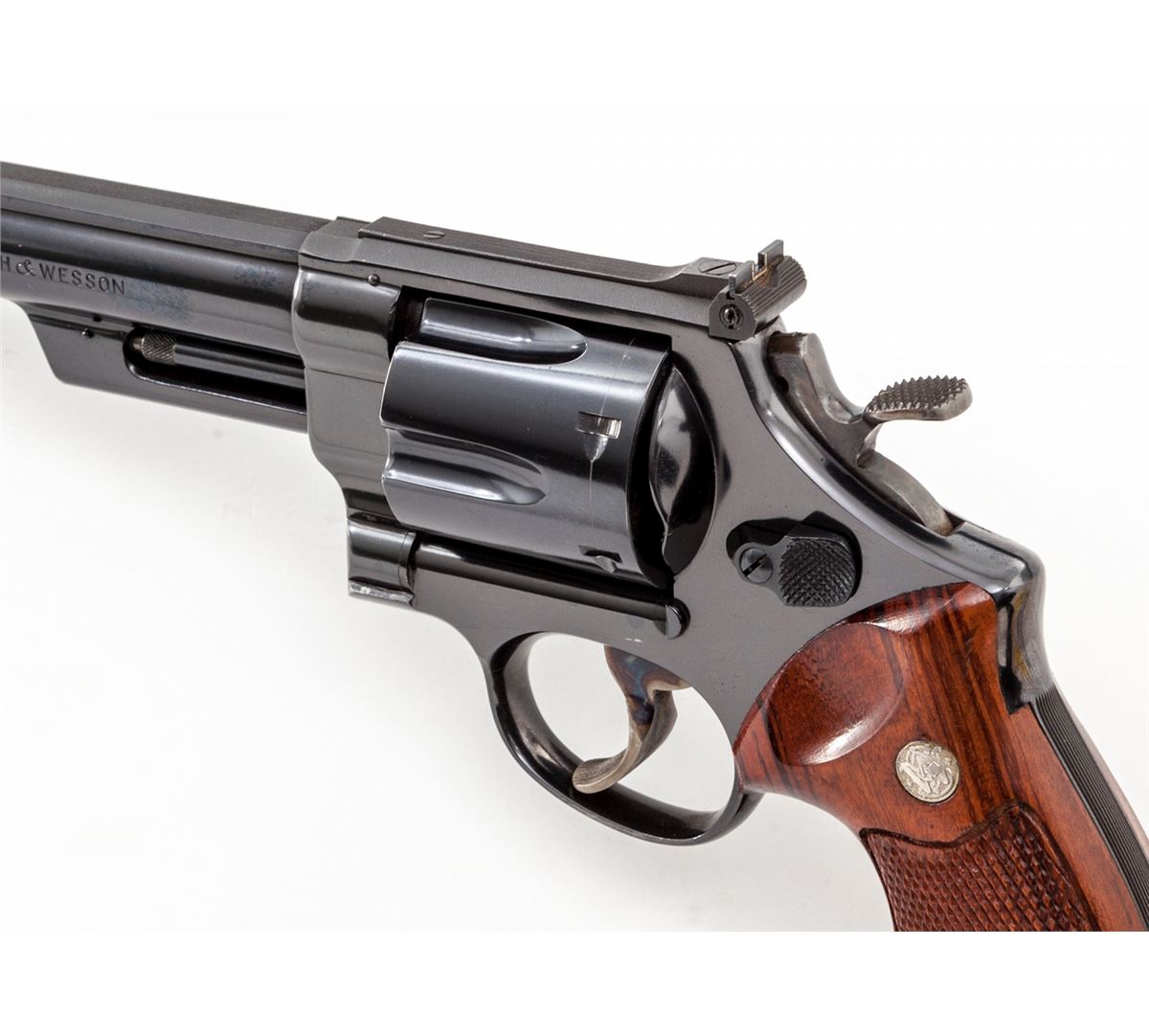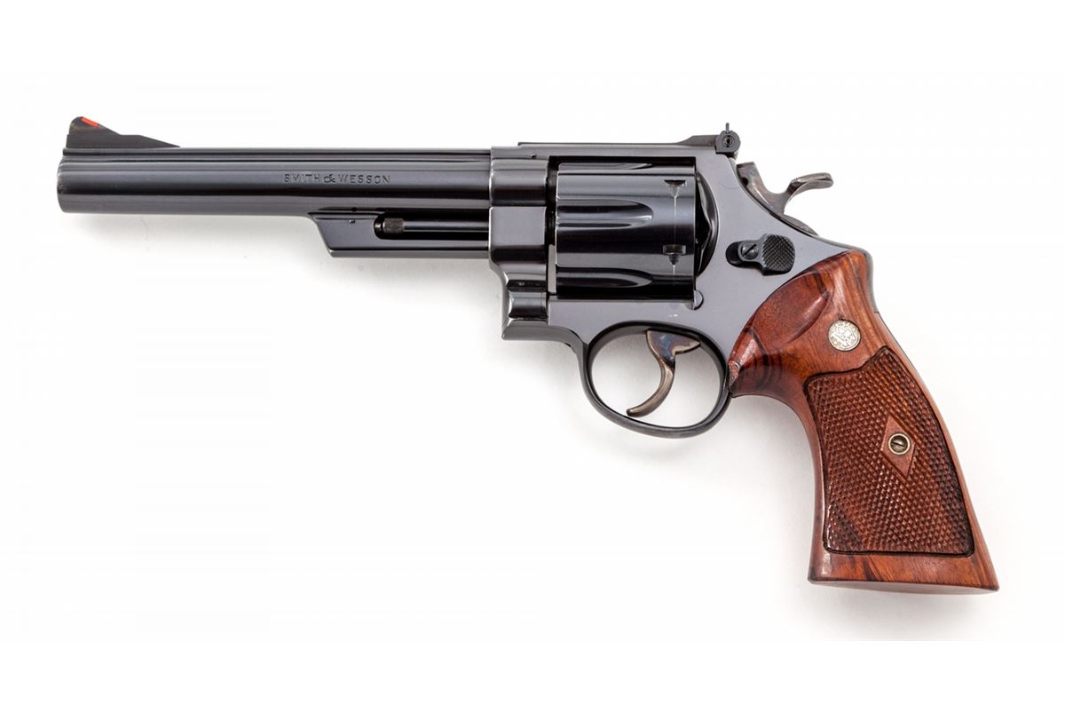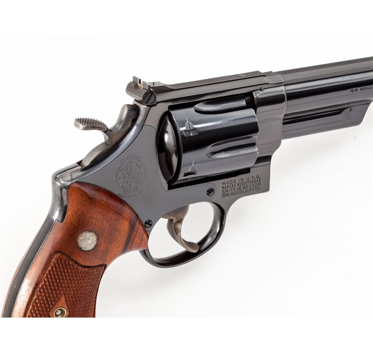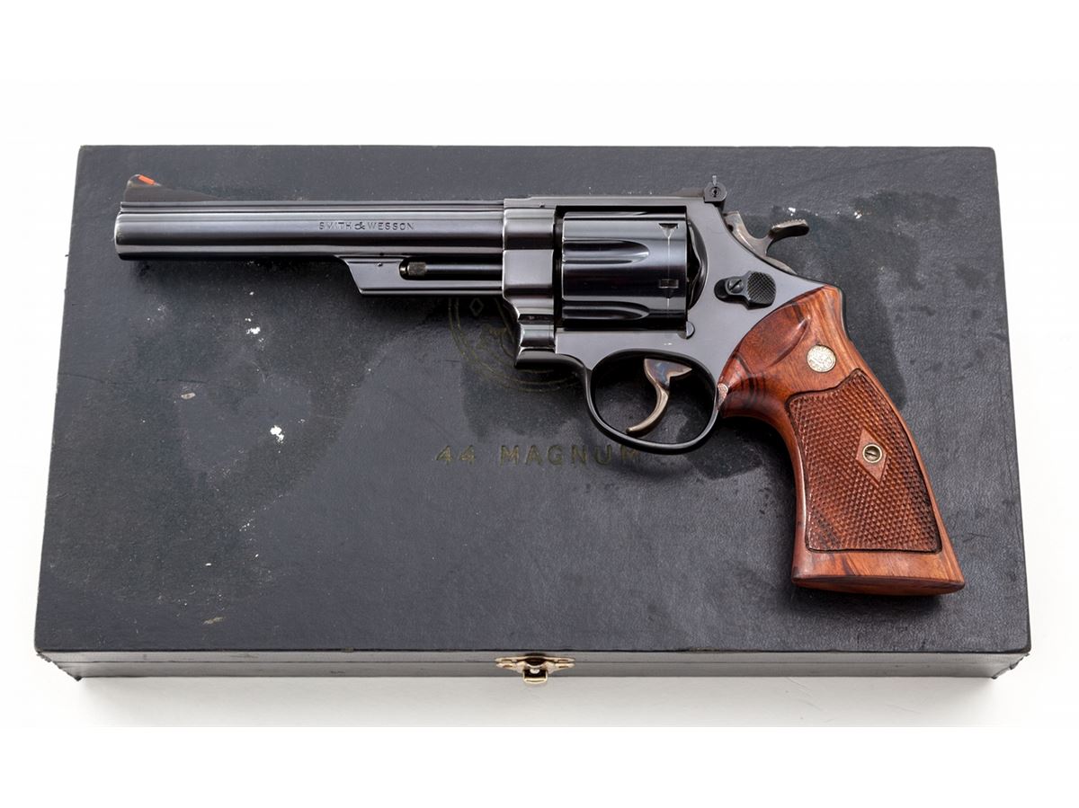 Early Smith & Wesson Model 29 Double Action Revolver, #S184820, .44 mag. cal., 6-1/2'' barrel, blue finish, red ramp front sight, white outline rear sight, target trigger, target hammer, with factory checkered large diamond walnut grips, in period original presentation box with screwdriver and cleaning accessories. Condition is excellent showing light wear at muzzle and very thin index mark to cylinder. Grips and action are crisp, bore is bright. Exterior of case with scuffs and damage. Est.: $1,500-$2,000. (C&R)