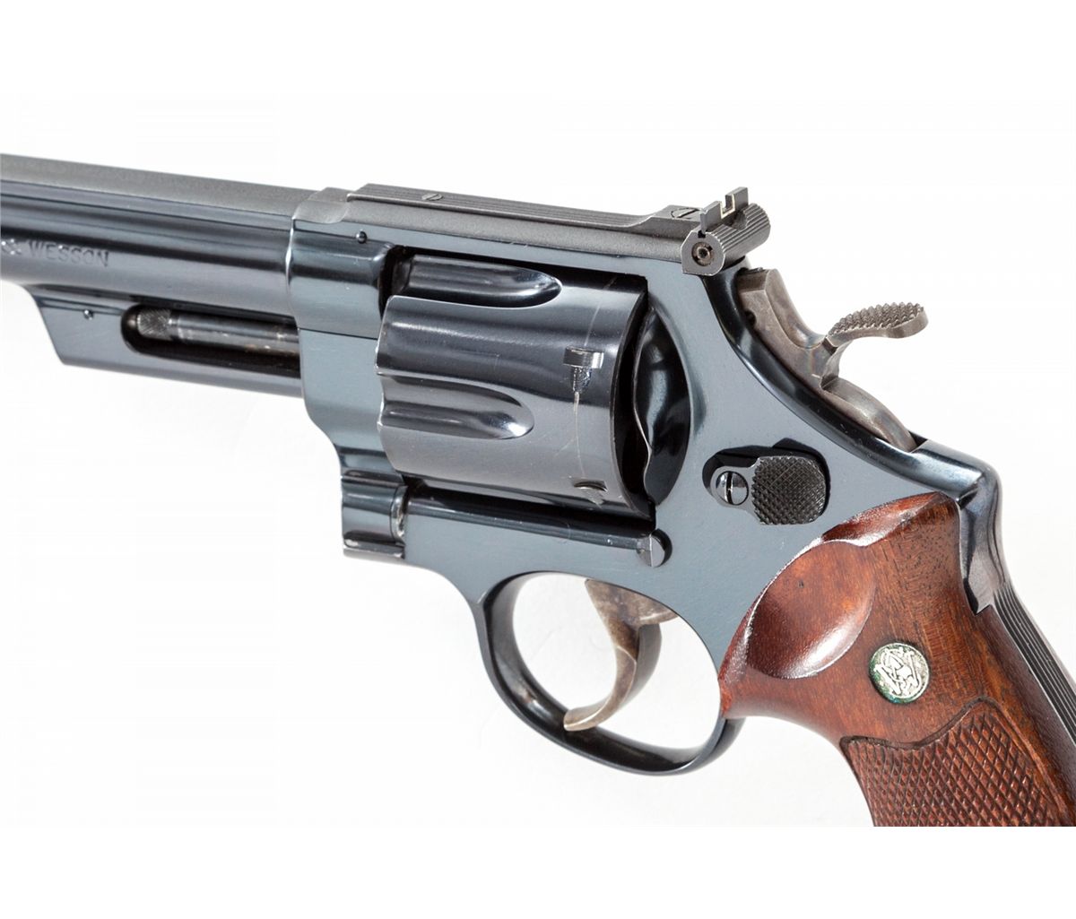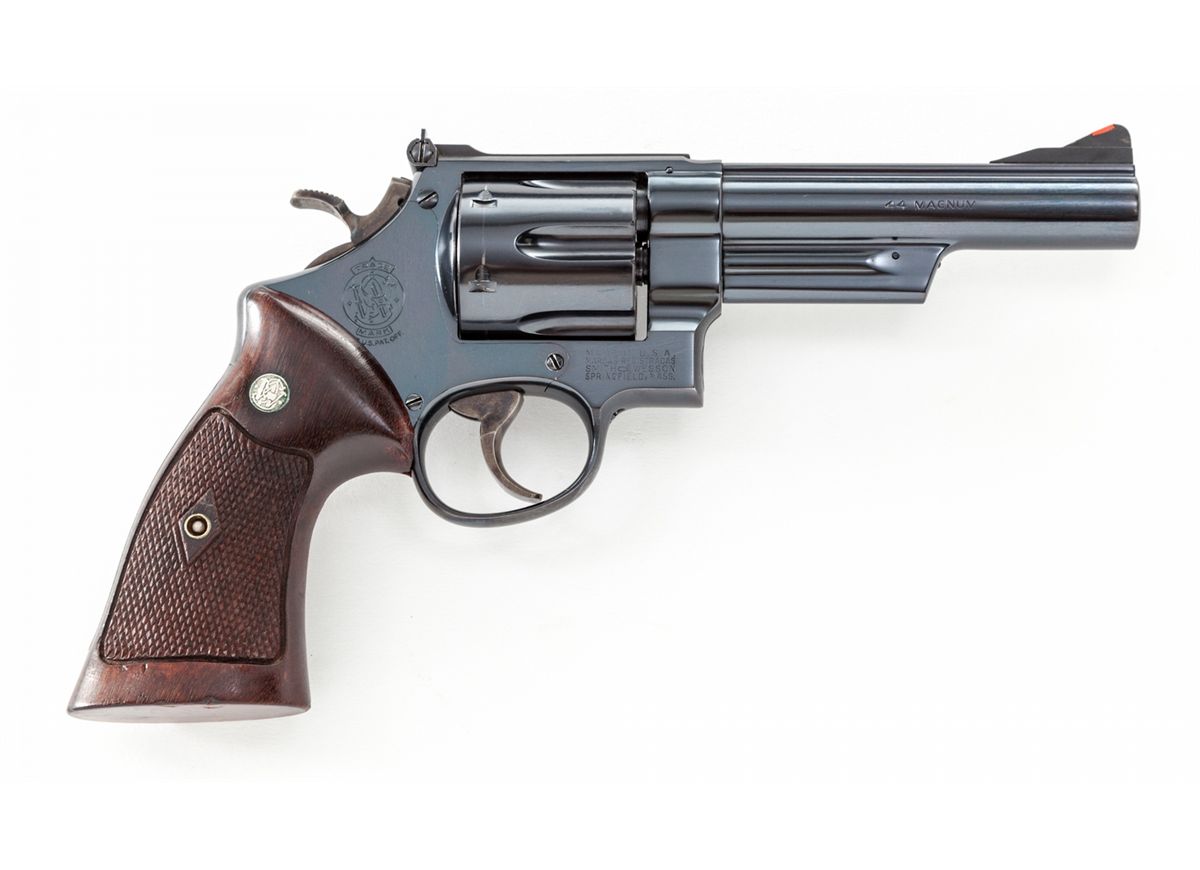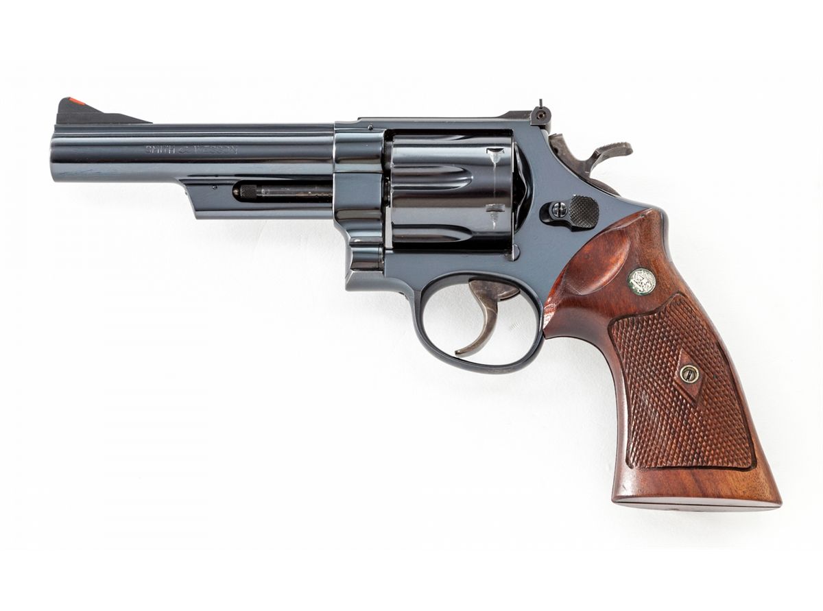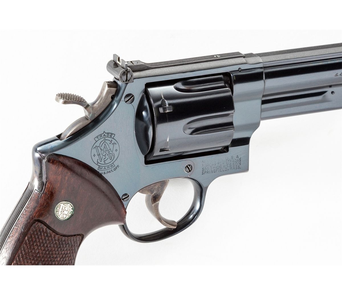 Early Smith & Wesson Pre-Model 29 5-Screw Double Action Revolver, #S153279, .44 mag. cal., 5'' barrel, blue finish, factory checkered large diamond target grips, with smooth target trigger, target hammer, red ramp and white outline sights. Mfg'd 1956. Condition is excellent, factory refinished in approx. 1968, showing light index mark to cylinder and minor wear at muzzle. Crisp checks to grips. Interior of right panel shows some glass-bedding compound and may be a replacement. Action is crisp, bore is bright. Est.: $2,000-$3,000. (C&R/PPT) (Ian Shein estate)