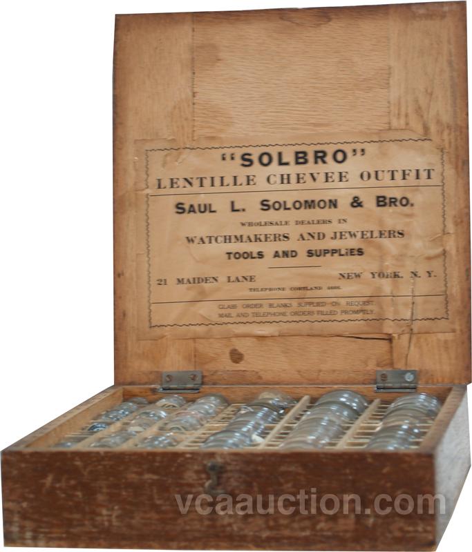 Early "SOLBRO" Saul L. Solomon & Bro. Watchmakers & Jewelers Tools & Supplies Wooden Box w/ watch repair supplies