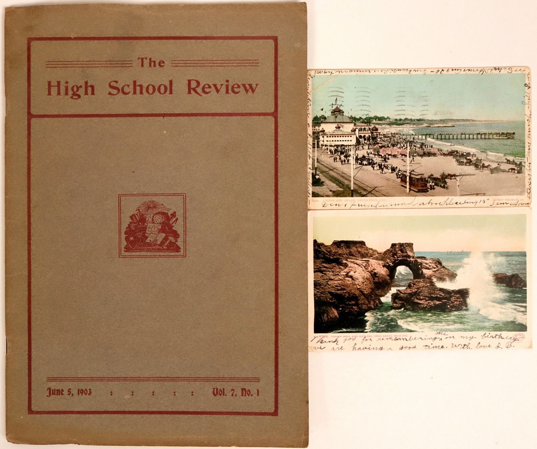 Nice couple of items from early 20th Century Santa Cruz and Santa Maria Ca. First, there is a colorful RPC of the beach, Municipal Pier and Casino, along with a beautiful RPC of Crown Arch located at Natural Bridges State Beach . Secondly, a 1903 review book of Santa Maria High School, showing the graduating class of 1903, all eight of them. It seems like an odd trio, but somehow, it works.