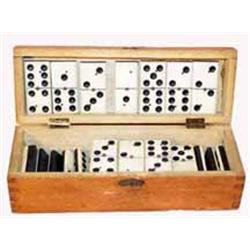 Early Set Of Bone & Ebony Dominoes in wooden case. Estimate $100-$150.