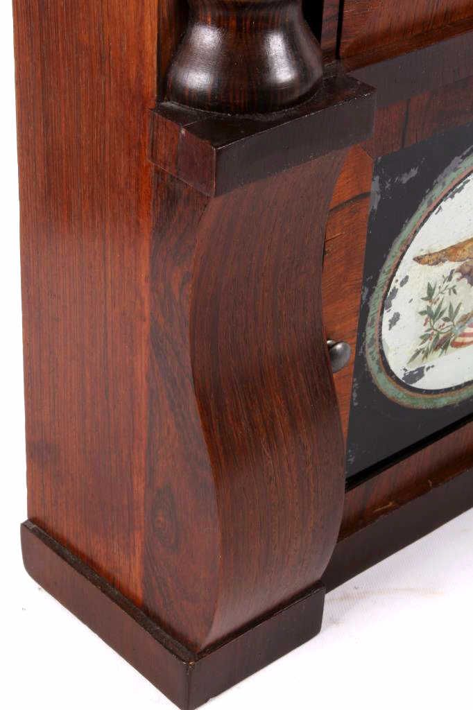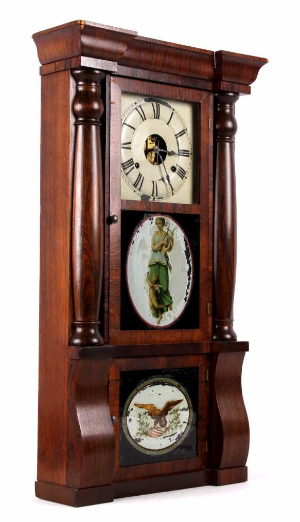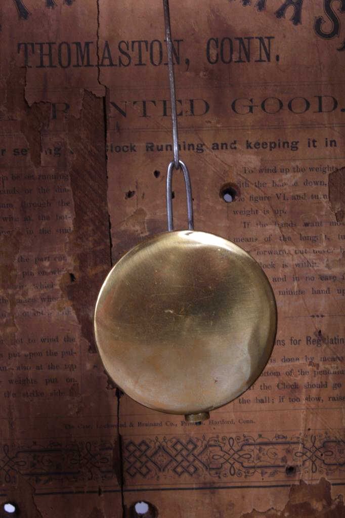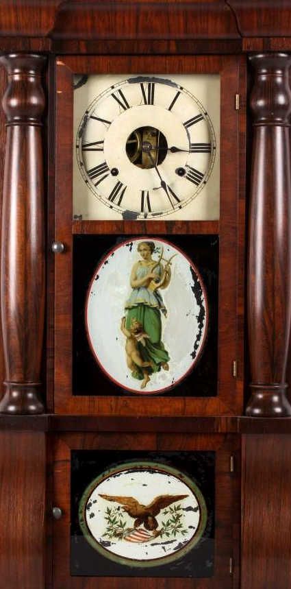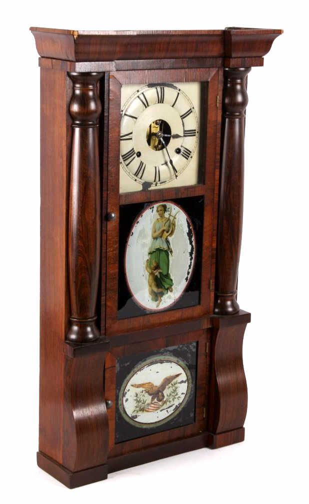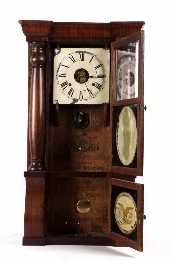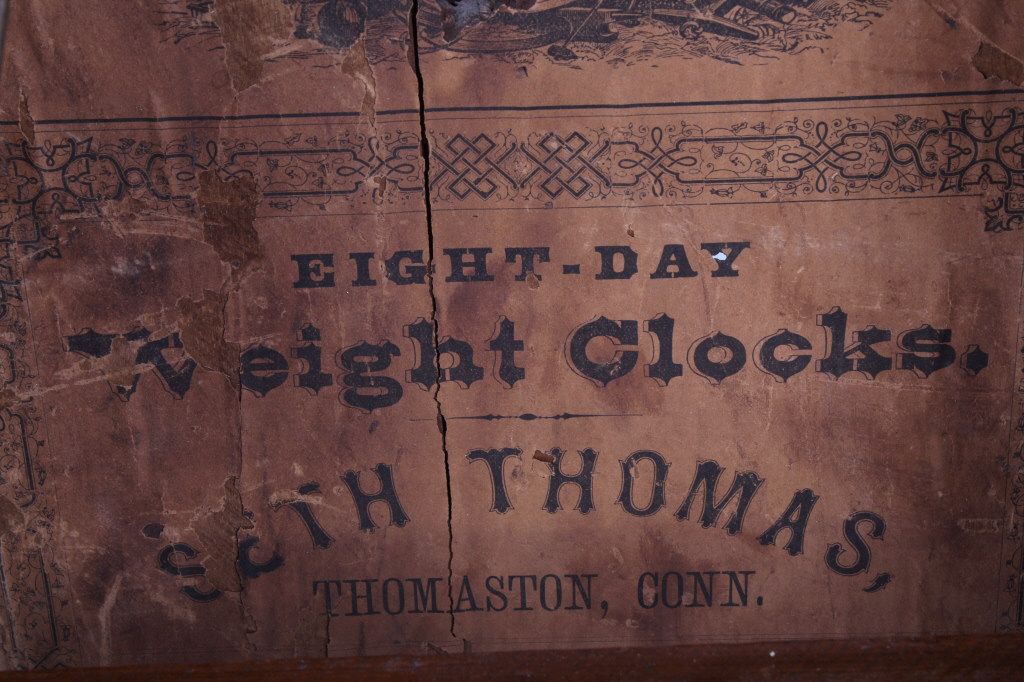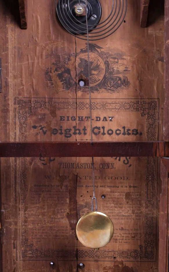 This is an original Seth Thomas Thomaston, Conn. Eight-Day Weight Clock. The piece shows a pillar and sleight front design with two doors. The doors are hand painted showing wonderful early Americana images with the top having a woman playing the harp with a cherub and the bottom having the Early American Eagle crest. This is a 19th century clock showing good condition and believed to work. The rare clock has both large weights, weight key, brass pendulum, and is believed to be complete. The rare clock measures 18 1/8"x5 7/8"x32 3/8"