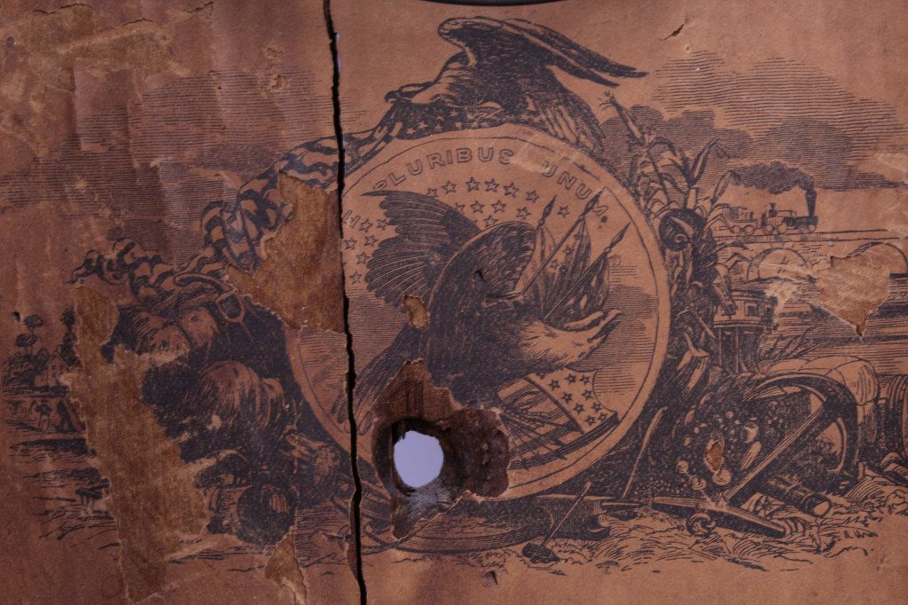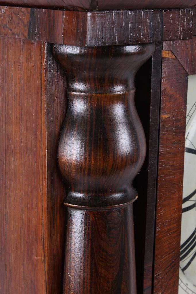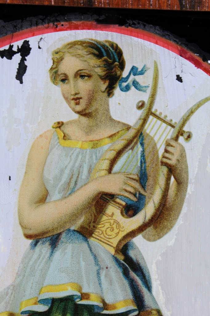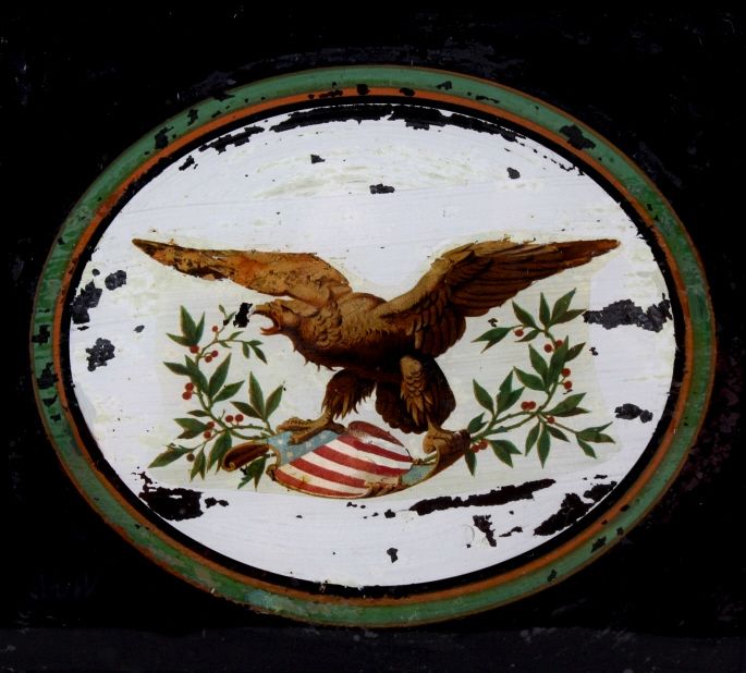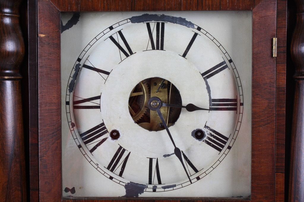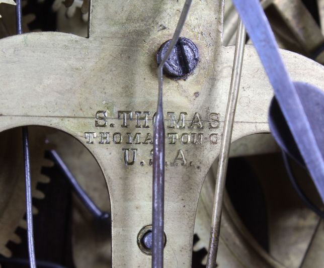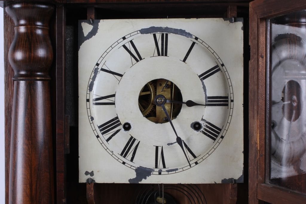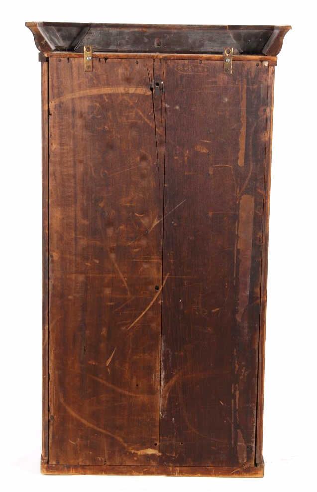 This is an original Seth Thomas Thomaston, Conn. Eight-Day Weight Clock. The piece shows a pillar and sleight front design with two doors. The doors are hand painted showing wonderful early Americana images with the top having a woman playing the harp with a cherub and the bottom having the Early American Eagle crest. This is a 19th century clock showing good condition and believed to work. The rare clock has both large weights, weight key, brass pendulum, and is believed to be complete. The rare clock measures 18 1/8"x5 7/8"x32 3/8"