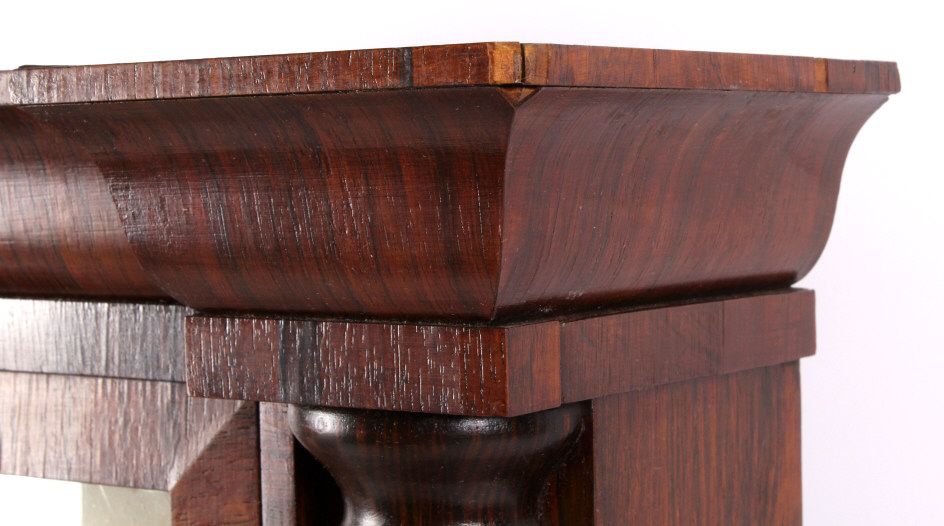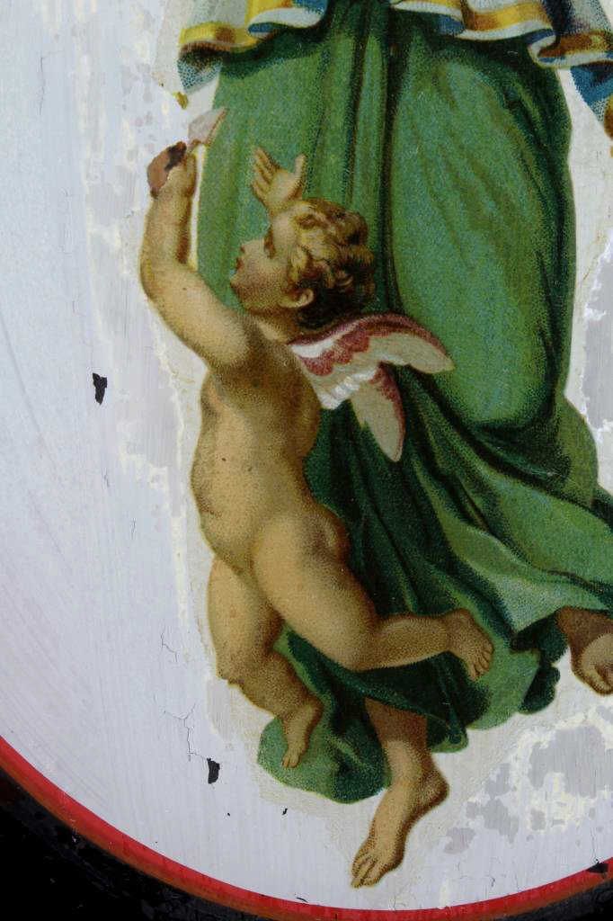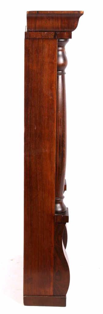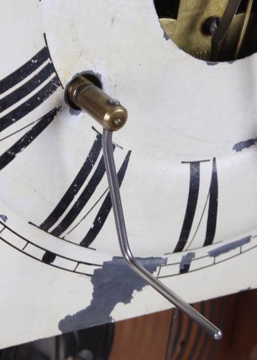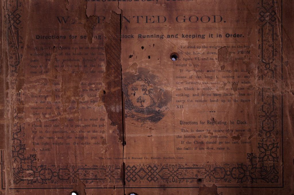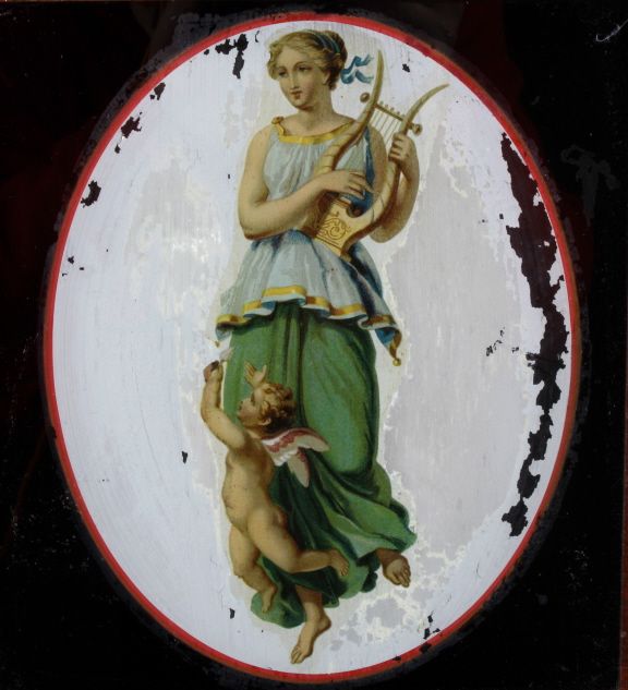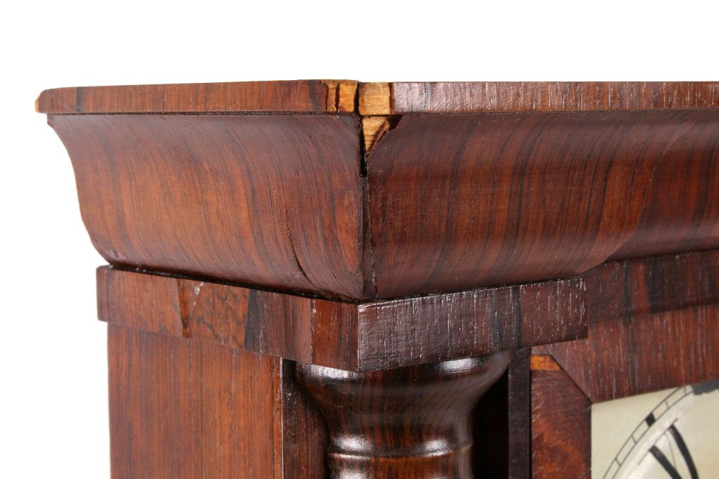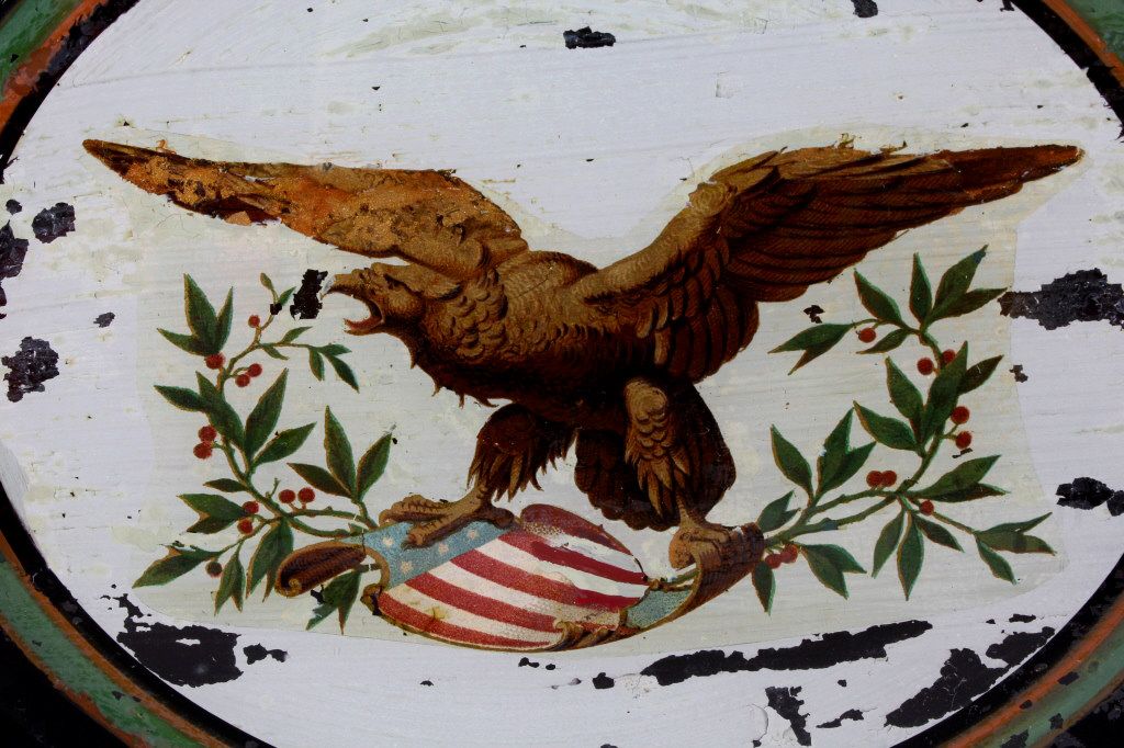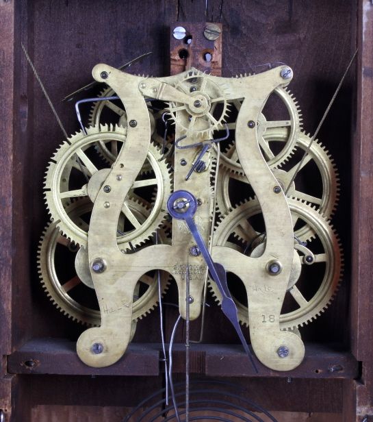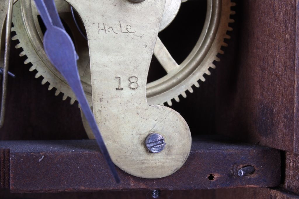 This is an original Seth Thomas Thomaston, Conn. Eight-Day Weight Clock. The piece shows a pillar and sleight front design with two doors. The doors are hand painted showing wonderful early Americana images with the top having a woman playing the harp with a cherub and the bottom having the Early American Eagle crest. This is a 19th century clock showing good condition and believed to work. The rare clock has both large weights, weight key, brass pendulum, and is believed to be complete. The rare clock measures 18 1/8"x5 7/8"x32 3/8"