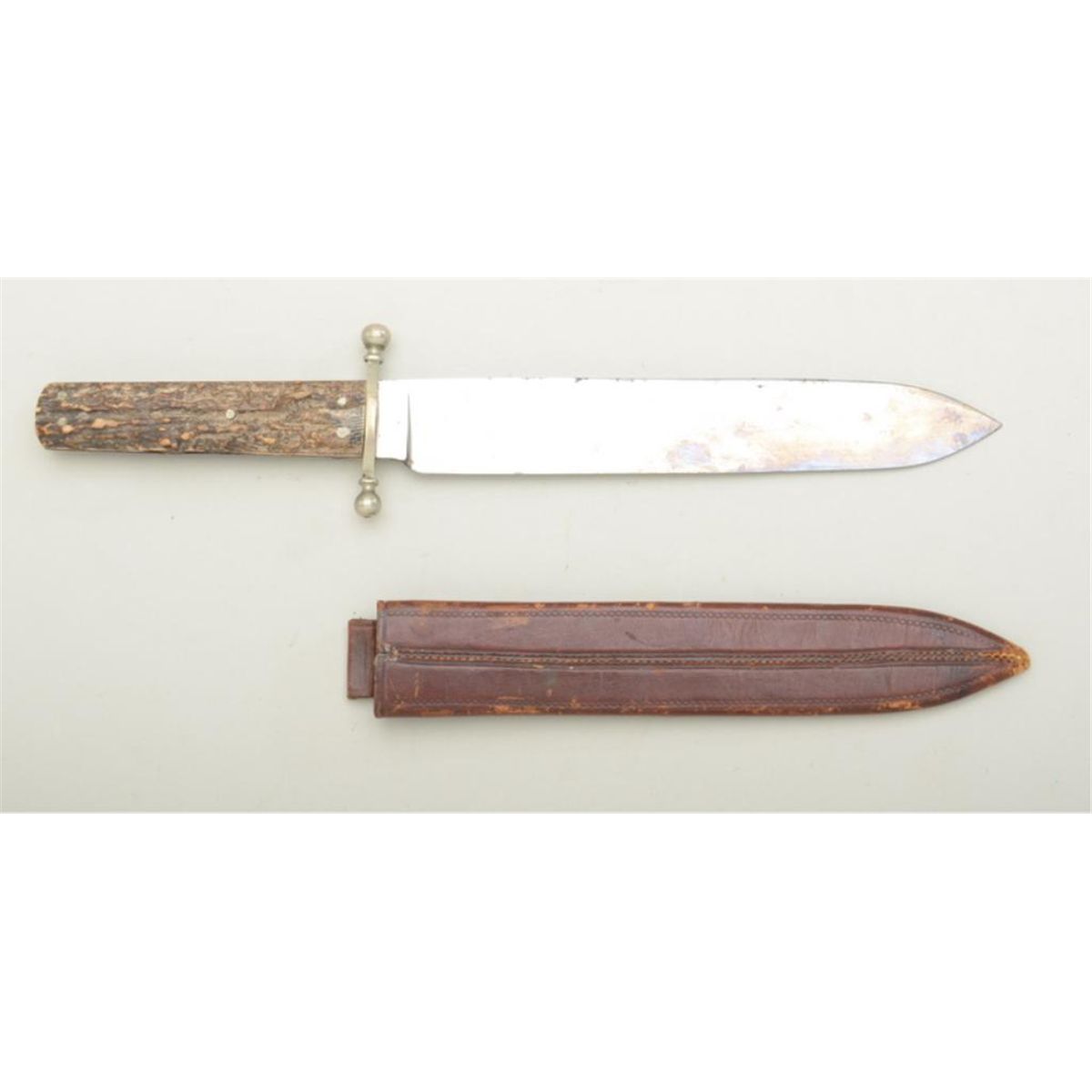 Early Sheffield spear point bowie knife by Thos. Turner & Co. with stag grips and leather sheath in overall very good condition; blade is marked “ENCORE”, knife is approx. 12” overall with an approx. 8”blade; sheath is also very good. Est.: $150-$300.