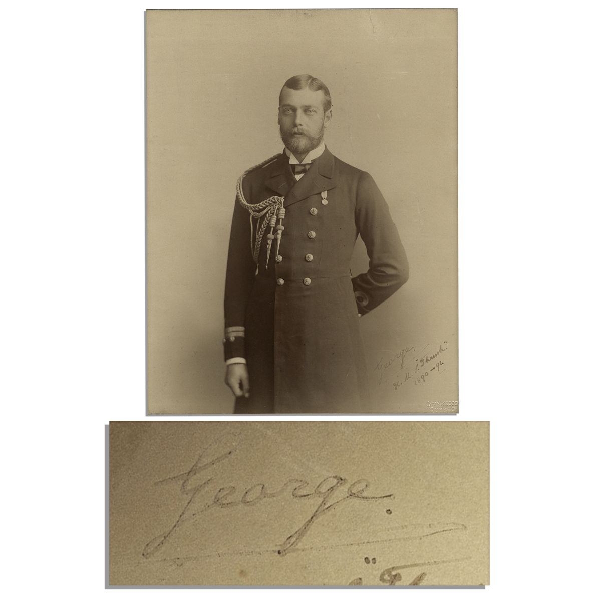 King George V photo, signed here as Prince, ''George / H.M.S. 'Thrush' / 1890-91'' as commander of the HMS Thrush gunboat in the Royal Navy. Portrait is blind-stamped to the lowermost right by Livernois of Quebec. Measures 7.25'' x 9.25''. Toning, an inch of cracking at right top edge and adhesive residue to verso, else near fine.