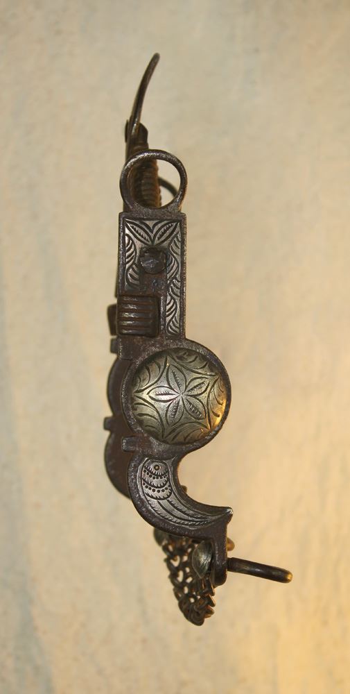 Intriguing, very early California style spade bit with attractive deeply engraved silver inlay.