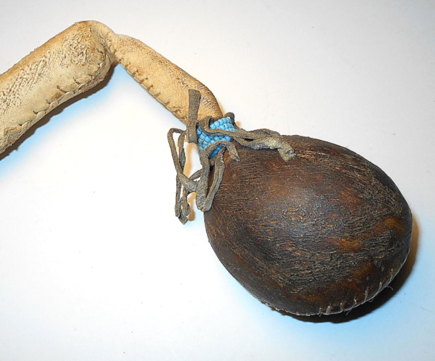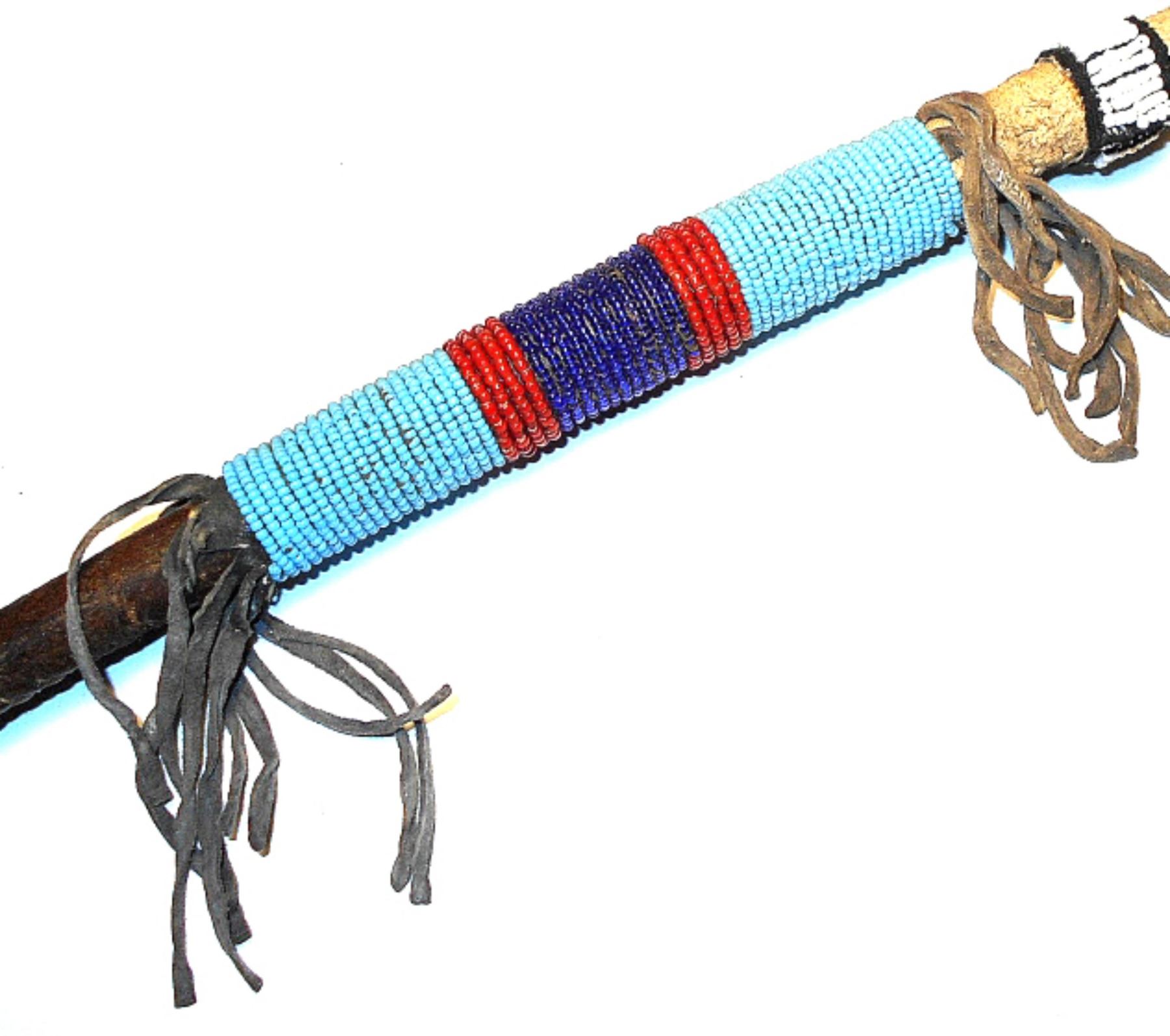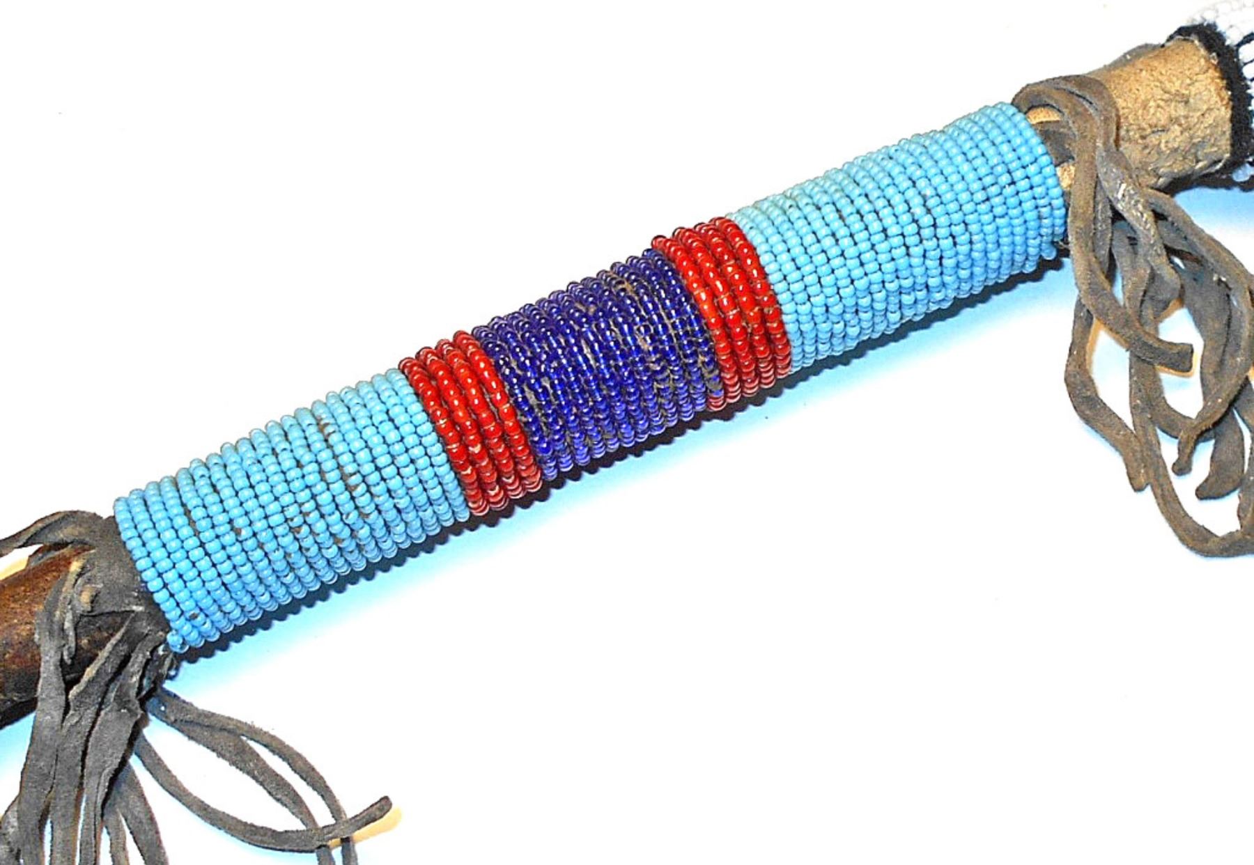 This is a unique, floppy head stone war club from the Sioux collected at the Standing Rock Sioux Indian Reservation in North Dakota. The antique to vintage piece shows a stone head wrapped in parfleche rawhide sewn with sinew lacing. The club wooden handle is wrapped in parfleche rawhide and sinew sewn as well as showing Indian hide fringes and wraps of old glass trade seed beads in sky padre light blue, chalk white, cobalt, red white heart and black. The end shows a large, twisted hide wrist throng. Provenance: From a large beadwork and weapons collection in Cincinnati, Ohio. The club measures 26-inches long with the head hanging 3-inches down and the stone head being 3-inches across.