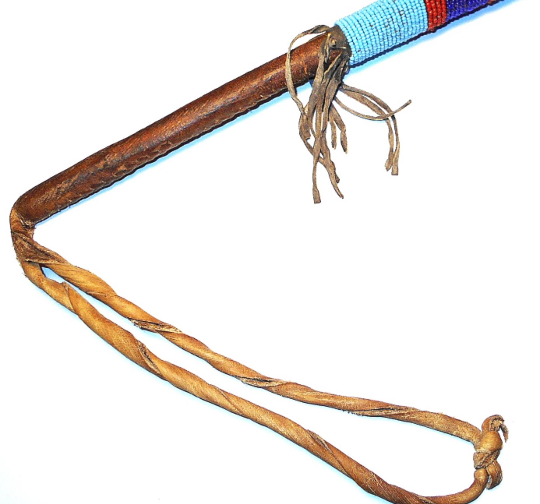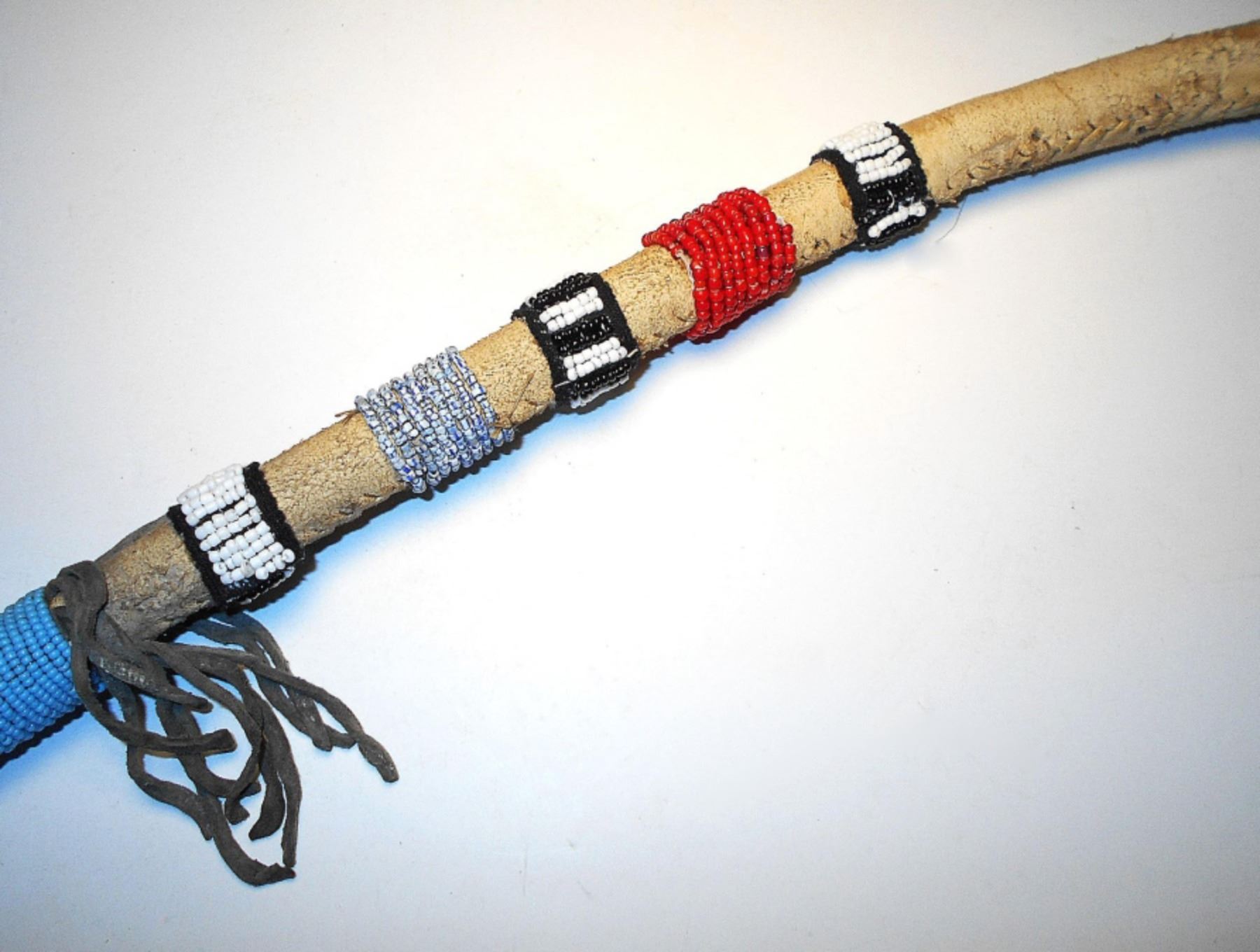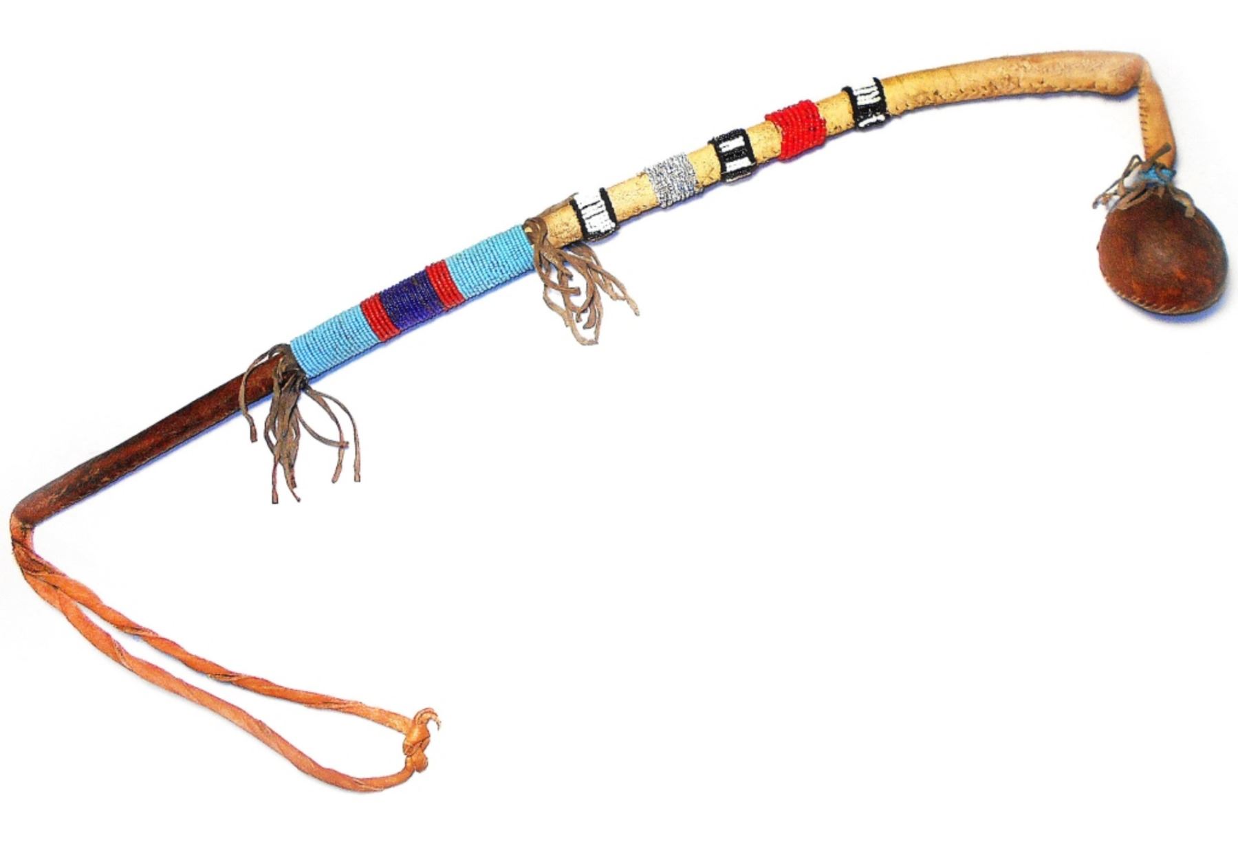This is a unique, floppy head stone war club from the Sioux collected at the Standing Rock Sioux Indian Reservation in North Dakota. The antique to vintage piece shows a stone head wrapped in parfleche rawhide sewn with sinew lacing. The club wooden handle is wrapped in parfleche rawhide and sinew sewn as well as showing Indian hide fringes and wraps of old glass trade seed beads in sky padre light blue, chalk white, cobalt, red white heart and black. The end shows a large, twisted hide wrist throng. Provenance: From a large beadwork and weapons collection in Cincinnati, Ohio. The club measures 26-inches long with the head hanging 3-inches down and the stone head being 3-inches across.
