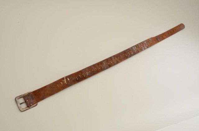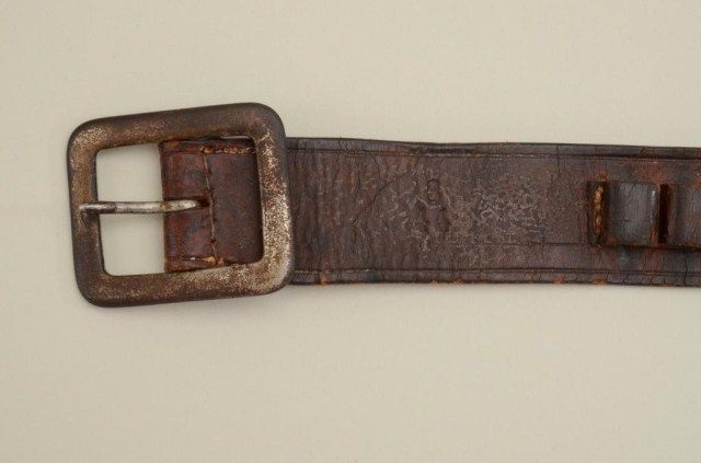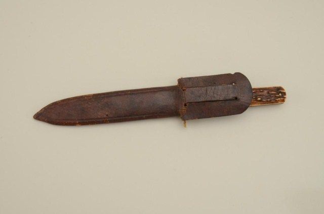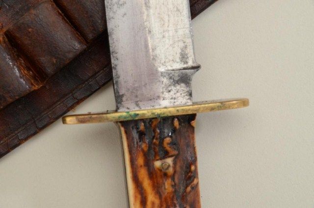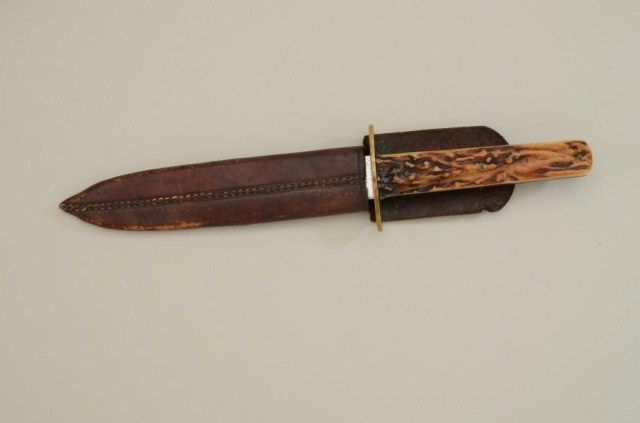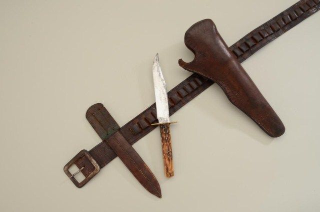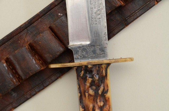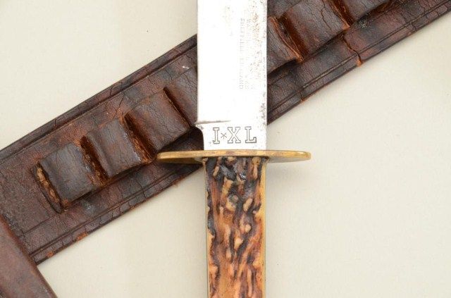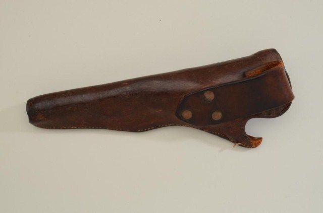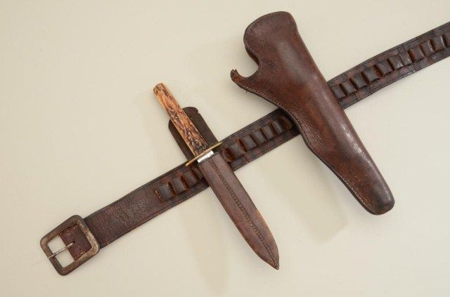 Early Slim Jim Holster for Colt SA circa 1870’s with cartridge belt and spear point bowie with scab by George Wosterholm with IXL. Trademark Holster good to very good normal cracking and age with light bordertooling, belt loop period re-enforced by added thick leather and 3 copper rivets like military. Cart belt fair with cracks, re-stitching of loops (period) and harness buckle. Bowie sharpened but good with 6-1/4” blade. Est.:$1,000.-$2,000.
