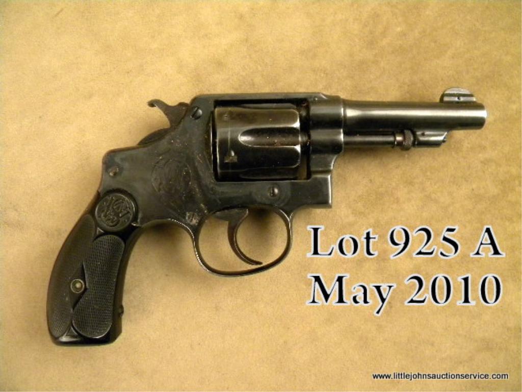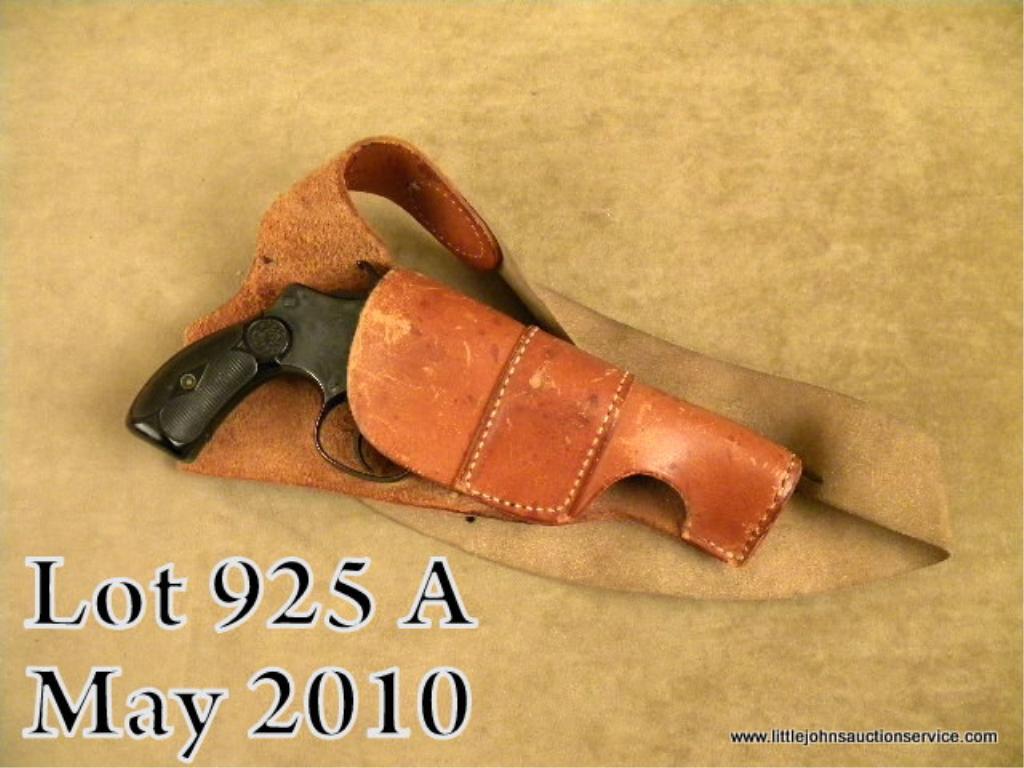 Early Smith & Wesson DA hand ejector, .32 Long cal., 3-1/4” barrel, 4-screw frame, re-blued finish, checkered hard rubber grips, #2071. This gun is in overall good condition as refinished showing approx. 94% old re-blue, good action andbore, matching frame, cylinder and barrel numbers, very good grips. Accompanied by a tan leather shoulder holster. Est.: $150-$225.
