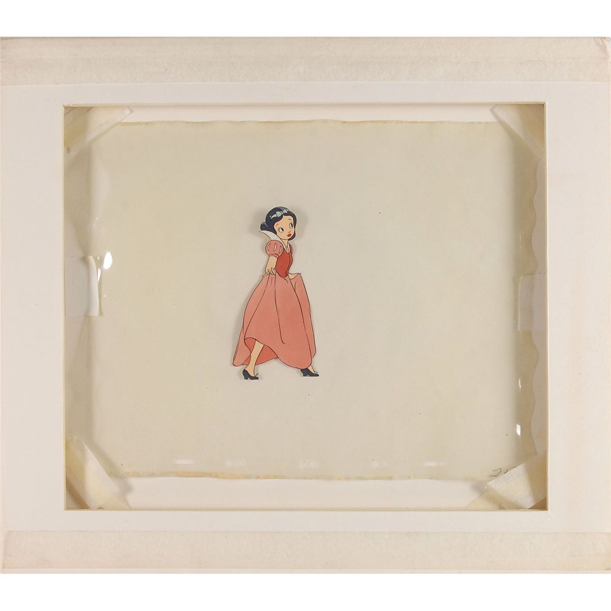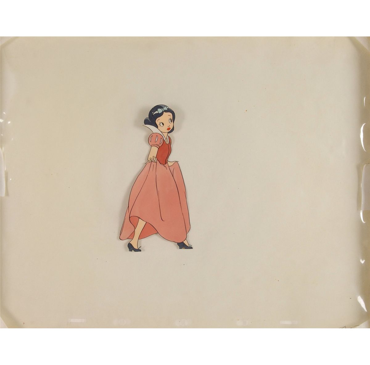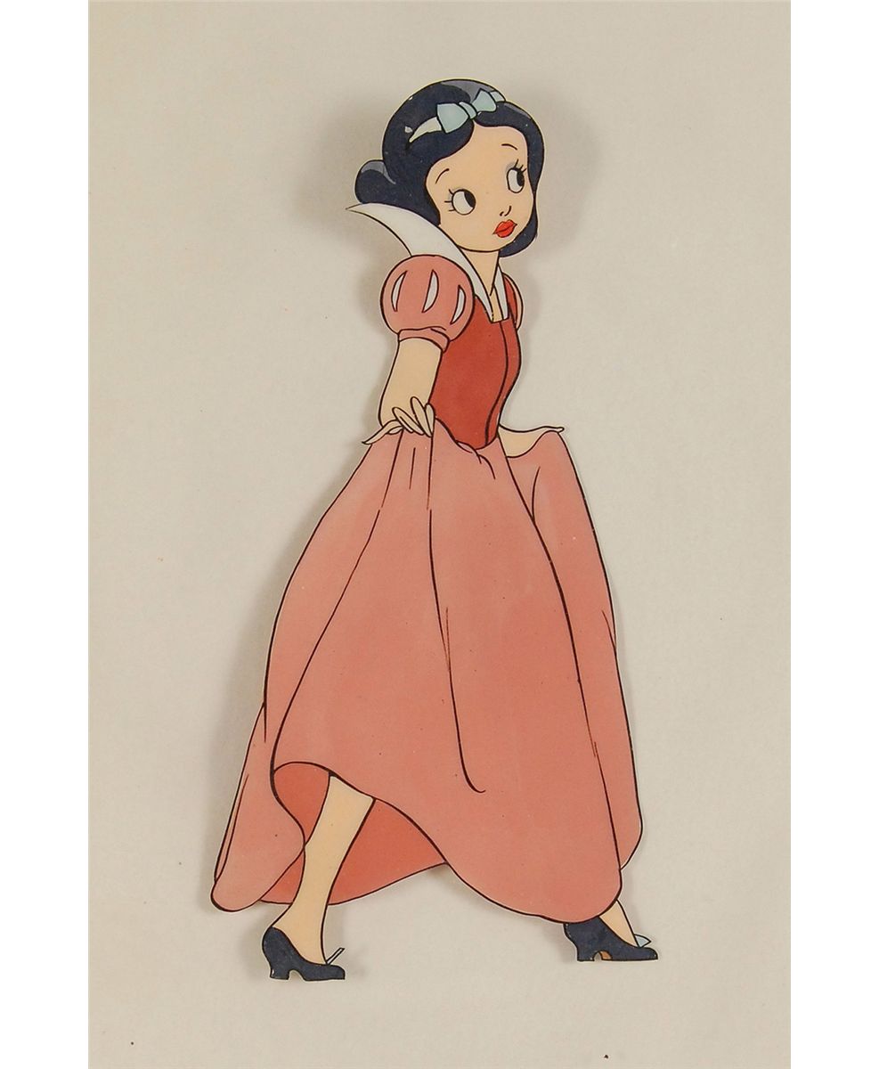 (Walt Disney Studios, 1937) Very early original preliminary production cel featuring Snow White from Snow White and the Seven Dwarfs, created circa 1935, showing her in a long pink dress with a blue bow in her hair. This rarity is on a full animation cel, complete with peg holes and a cel number at the bottom right, not to be mistaken for a color model. Image measures 2.25 x 5, with overall dimensions of 12.25 x 9.75. In fine condition. This is the earliest example of a Snow White production cel that we have ever seen. Walt Disney changed this design of the princess because he felt it was too ‘cartoony’—too reminiscent of Betty Boop—to be used for final production in a more serious film. This may be the earliest animated Snow White cel in existence. An extremely rare historical piece.