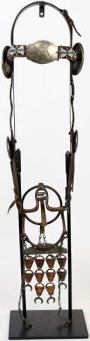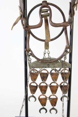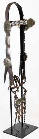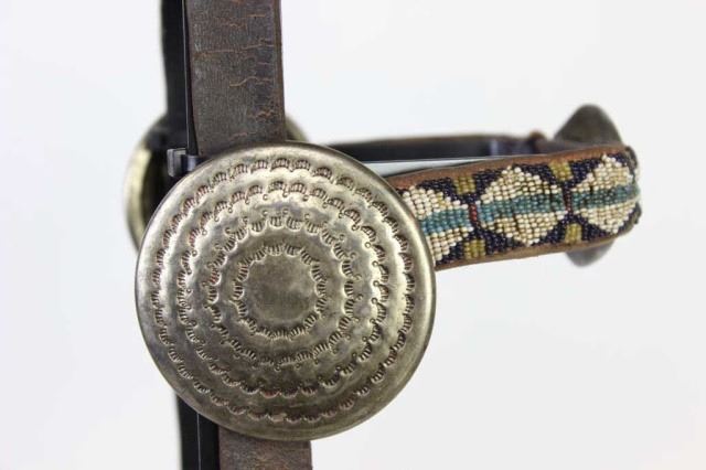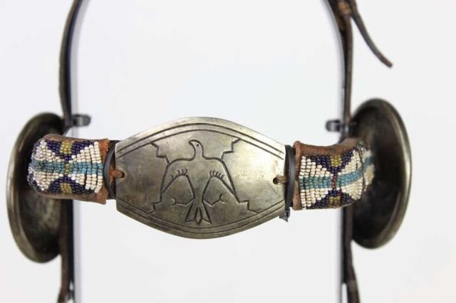Early Southern Plains Navajo style bridlewith ring bit, the brow band in beaded geometric patterns on banned leather with white centered, red, blues, greasy yellow and white beads, the nickel silver frontal engraved in thunderbird pattern, all fittedon harness leather with adjustable head strap all showing very good condition, includes display stand. Est. 1200-2400
