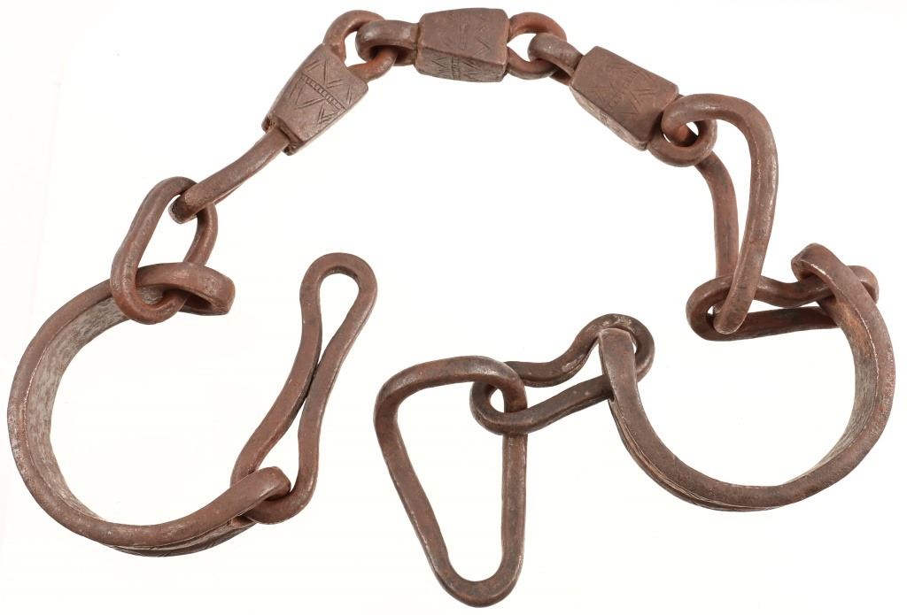 Circa 17th Century Spanish Colonial Period shackles similar to ones seen from Inquisition Prison in Mexico City. 1.5" width of shackle cuff , 34" total length.
