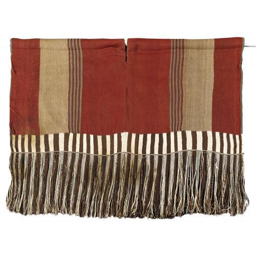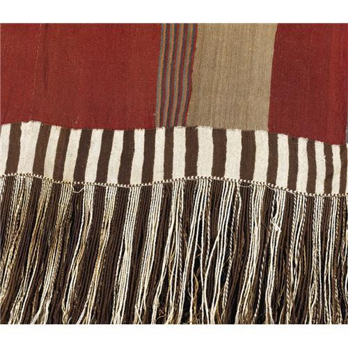 <B>Tunic</B></I><BR>Late Horizon or Early Spanish-Colonial<BR>A.D. 1400 - 1600<BR>Camelid and cotton fibers<BR>Length 58 in. Width 48 in.<BR><BR>The principal color of this tunic is a deep cochineal red. Set symmetrically to each side at the position of the outer torso limits are bands of four contiguous units of narrow vertical stripes in green, dusky pink, dark blue, and the same deep cochineal red. Beyond these at each side is a wider band of natural brown followed by an equal-sized band of the cochineal red. A narrow green band terminates each edge. Woven into this principal tunic body at the bottom borders is a continuous five-and-one-half inch wide band of alternating seven-eighths inch vertical stripes of natural dark brown and white. This ends in a single horizontal small-scale chevron band of the same two colors with its points moving from the outer edge to meet at the center. Below this is a brown and white fringe of roughly thirteen-and-one-half inches, each change of color marked by a twisted fringe element combining brown and white. The condition generally is good, with a few losses and minor staining.<BR><BR>Provenance<BR>Arte Textil (Steve Berger), San Francisco, California<BR><BR> <BR><BR><B>Important notice: