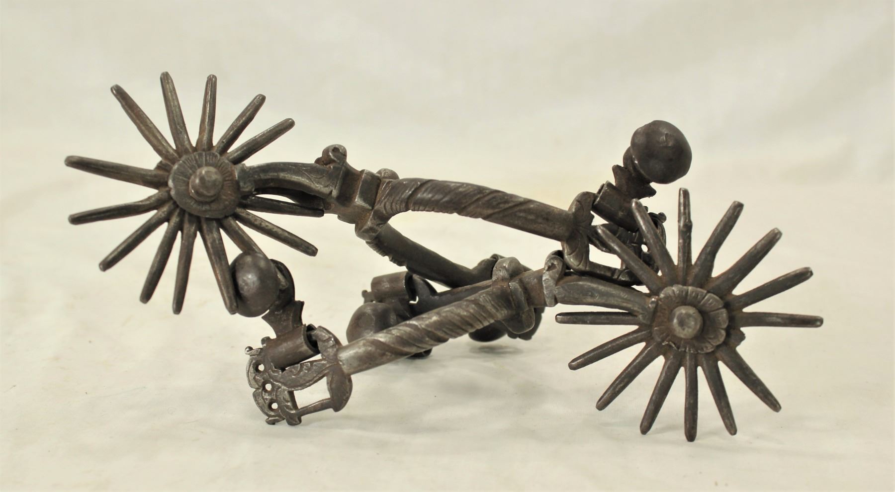 Intricately done iron spurs with rolled and chased heelbands, and huge rowels.