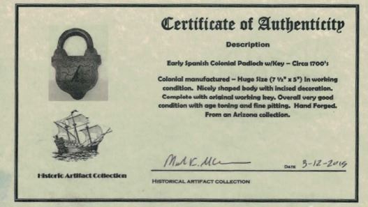 Early Spanish colonial padlock with key, circa 1700s. 875 grams, 7-1/2" x 5". Monstrous, colonially-made and hand-forged metal lock with original working key, nicely shaped with incised decoration, all in working condition. With photo-certificate.