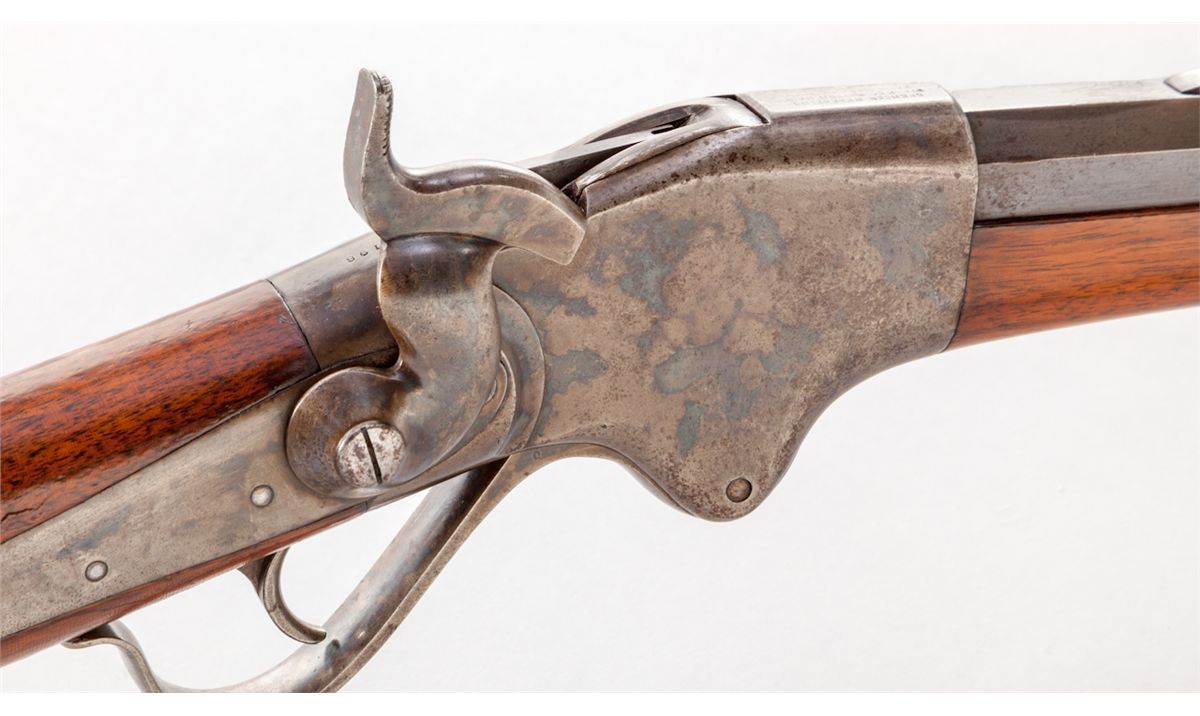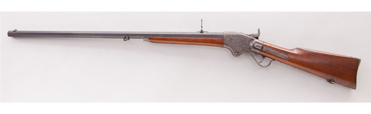 Early Spencer Sporting Rifle, #34198, .46 RF cal., 32'' octagon barrel, blue and case hardened finish, smooth straight walnut buttstock and forend, small steel Schnaubel forend cap, Winchester type sporting leaf musket rear sight, and standard sporting front sight. Mfg'd 1870-1875 using surplus military Carbine frames. Condition is excellent retaining approx. 95%+ thinning and lightly toning blue to barrel. Frame with vivid case colors with thinning and light toning at balance point. Stock and forend show light overall crazing to original varnish, minor dings and light scuffs. Action is crisp, bore is excellent and bright. Est.: $5,000-$7,500. (Antique)