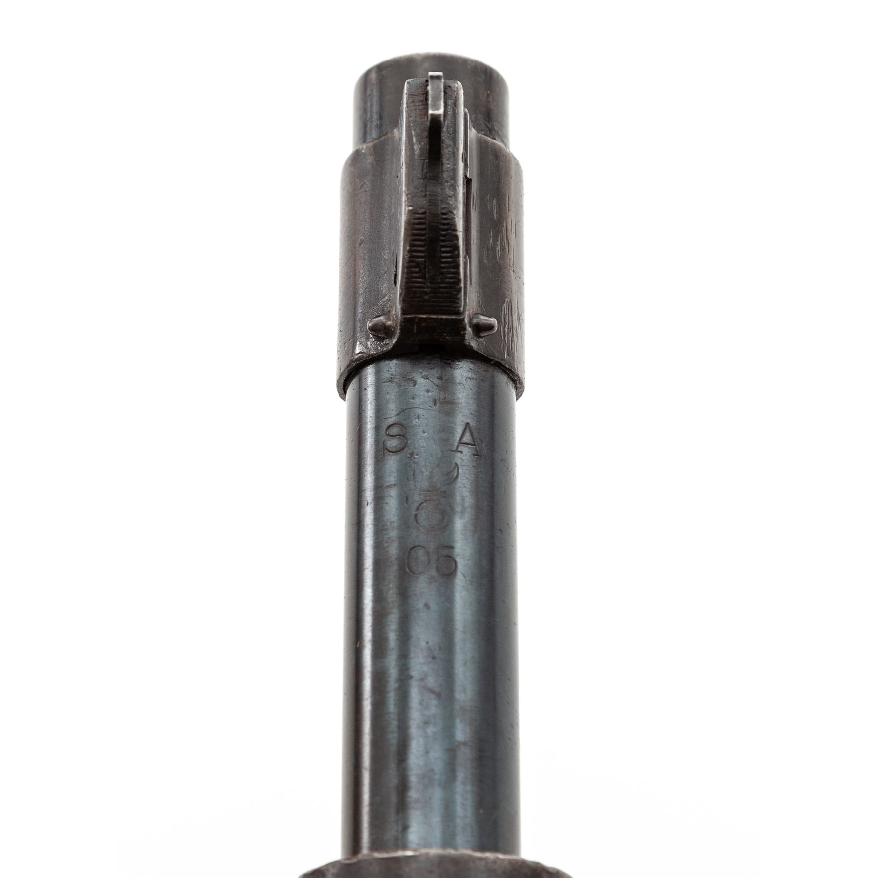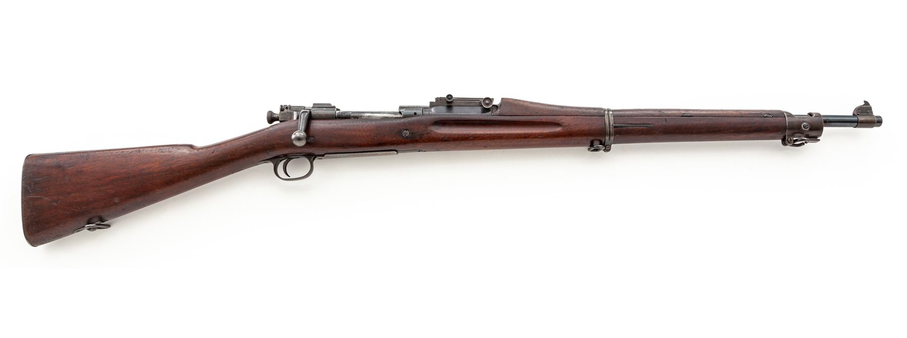 Early Springfield M1903 Bolt Action Rifle, #89354, .30-06 cal., 24'' barrel, parkerized finish, walnut stock, blade front sight and adjustable folding leaf rear sight. Marked on receiver ring ''U.S.SPRINGFIELD ARMORY MODEL 1903'', and on barrel behind front sight ''SA/(flaming bomb)/05''. There is a boxed ''J.F.C.''(J.F. Coyle) cartouche on left side of stock behind the cutoff that appears to have had added carving to the letters at some point. There is a ''P'' firing proof on underside of wrist. Right side of receiver was drilled with two holes for a sight and both are now plugged. This may have been a rod bayonet rifle as the early finger-groove stock has a wood insert in the tip of the forend stamped ''S'', which would have been used to fill the rod channel when it was arsenal converted into its later present configuration. Front sight blade is a U.S.M.C #10 type, with early high handguard. Condition overall is very good with approx. 85% finish remaining on the metal, with finish flaking on the receiver and bolt and thinning and browning to the magazine floorplate and barrel. Wood has a half-inch re-attached chip at the tang, otherwise very good, with an even color to the finish and overall handling marks. Action is smooth, bore is fair with darkening and roughness forward of the chamber and good rifling.  Est.:  $700-$1,100. (C&R)