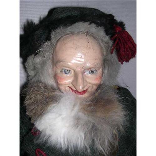 This is a very unusual item. I purchased him from an elderly gentleman who went to Germany every year for his business. He traveled in the 1930's through the 1950's. He couldn't remember when he bought this item. He called it St. Nick. The head is a type of wood composition I believe. It has cracks coming down from the head. Maybe he was dropped at one time. He is 25" tall and has trim on his outfit that is falling apart. He also has it for hair and beard. He has a very character face- Long nose but wide smile. Lots of detail to the eyes and even has the red dot in the center by the bridge of the nose. The top jacket has a hood and he has a hat with a tassel on it. The hat is made out of the same material as the top jacket. The clothes do not come off so I don't want to undo stitches. He has leather arms. Old leather eyelet lace up boots. There are some holes in his clothing but he is just so unusual. I think he might be horsehair stuffed as he's very heavy and he's very tightly packed. He comes from a smoke free environment. Item is sold as is. He is pictured in one of the books that Polly Judd did on Santas. She had requested a picture from me to include in the book. He is valued quite high in the book. If you like unusual, then this is one for you. The cracks have not bothered me since I have had him. If you can love him, please bid. Buyer to pay $20 shipping, handling, and isurance in the U.S. Thanks for viewing.