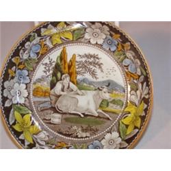 Early Staffordshire handless cup & saucer with farm scene. Saucer measures 5 1/4" in dia. and cup is 2" tall.