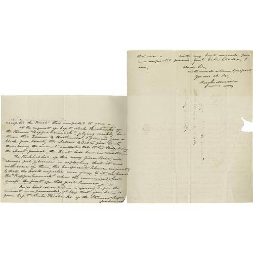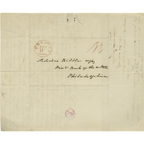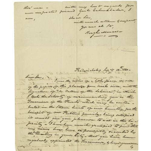<B>(Early Steamboats) Hugh T. Mercer, Two Autograph Letters Signed </B></I>"<I>Hugh Mercer</B></I>", each two pages, 8" x 10", Fredericksburg, Virginia, August 21, 1830 and September 10, 1830 to Nicholas Biddle, President of the Bank of the United States, discussing the newly-opened ferry service between Fredericksburg and Baltimore. Hugh T. Mercer, the son of Revolutionary War surgeon Hugh Mercer and father of Confederate General Hugh Weedon Mercer, writes to Biddle on August 21: "<I>Thinking it quite probable that the Stock of our New Steamer, plying between this & Balt[im]o[re] will be good Stock, will you be so good as to inform me... whether you can procure for me... a few Shares...</B></I>" On September 10, he writes again to Biddle: "<I>I was the writer of a little piece in one of the papers of this place a few weeks since, with the Signature of 'a Patron of the Scheme,' in which I took the Liberty of recommending you as the Treasurer of the Funds which may be contributed in the Steam boats of our Country, or the benefit of Mr Fulton' family... at the request of Capt Noah Fairbanks of the Steamer 'Rappahannock,' plying weekly between this Town & Baltimore, I forward you a Check for twenty two Dollars & fifty five Cents, that being the amount contributed to his Box, during the short period the Boat has been in motion. The Stockholders of this very fine Boat, will always feel pleasure in reflecting that it was with some of them, this beneficent Scheme originated, & that the first impulse was given to it on board the 'Rappahannock' when she commenced her route the first of the past summer...</B></I>" With integral address panels. Extremely light toning, usual folds, small loss from seal tear, first page of one letter neatly trimmed, else fine condition. Early documents of this nature detailing the formative years of travel and commerce are quite significant. From the Henry E. Luhrs Collection. Accompanied by LOA from PSA/DNA.