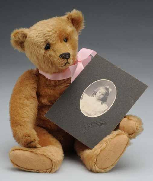 Description Germany, early 1900s. Apricot mohair, long snout, black button eyes, small hump on back, shaven muzzle, sewn nose, long arms, felt paw pads, sewn claws. No button in ear, replaced satin ribbon. Wonderful look, excellent condition. Childhood bear of Marianne Shaub, photo of child and provenance attached. Condition (Excellent). Size 12" T.