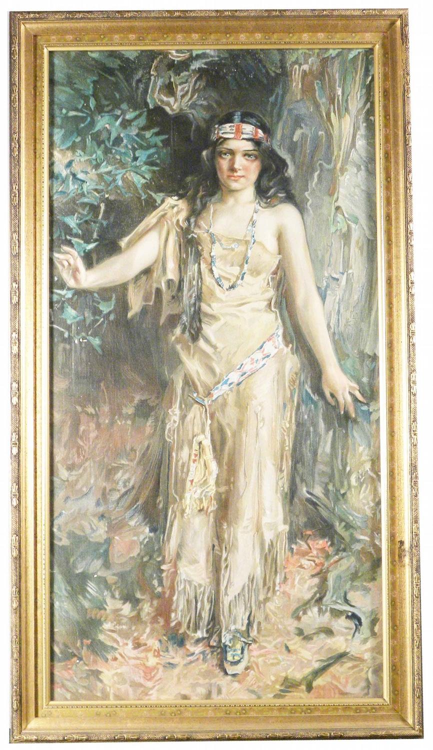 Early Stock Print of Indian Squaw often used for advertising. Framed under glass. Excellent condition. 13 X 25 1/2 inches image only.