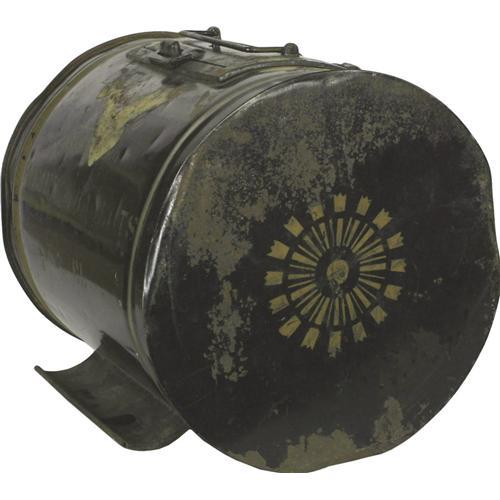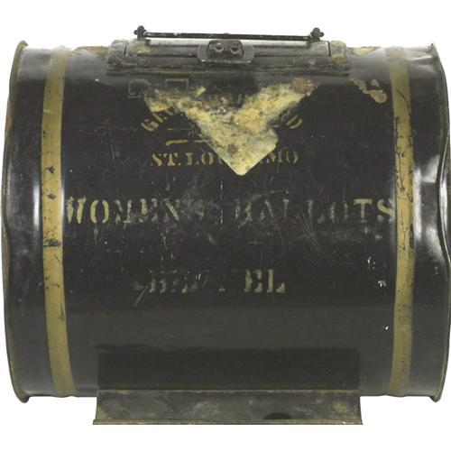 <B>Early Suffrage Voting Container.</B></I> Women used this piece to cast their votes in a local election. The Suffragettes had lobbied for the right to vote since 1848, when the Seneca Falls Convention passed the "Declaration of Sentiment." When they finally were allowed to vote, often it was just in local or state elections. This large drum shaped tin ballot box was probably used in that way. The tin, showing much wear but maintaining much of its original tole wear decor, is stenciled with the tin makers' name along with the identification of "Women's Ballots." The "box" shows remnants of the original paper seal around the closure giving it credibility as having been put to use. Seldom seen and rarely offered this early piece is one of the more unusual and historical of items relating to the Suffrage Movement. Diameter 12".