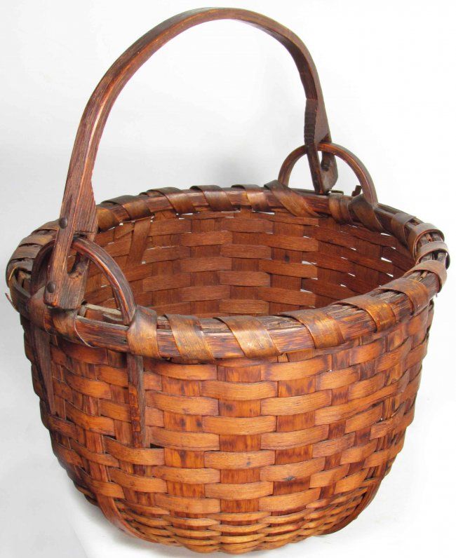 Swing-Handle Basket, fastened on reinforced solid wood loop. Solid reinforced wood bottom. A couple of minor breaks otherwise excellent condition. 12 inch diameter X 8 inches tall.