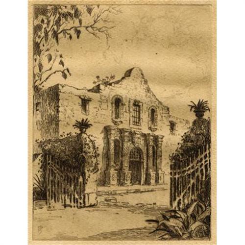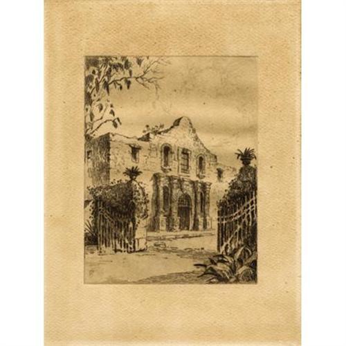 <B>UNKNOWN<BR></B></I><I>The Alamo<BR></B></I>Etching on paper<BR>8 x 6 inches (20.3 x 15.2 cm)<BR>Unidentified monogram in plate at lower left<BR><BR> <B>Condition Report:</B> General toning to paper, otherwise in excellent condition. Unframed.<BR><BR><b>Shipping:</b> Requires 3rd Party Shipping (<a target="_blank" href="http://www.heritageauctions.com/common/shipping.php">view shipping information</a>)