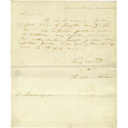<B>Early Thaddeus Stevens Autograph Letter Signed</B></I> “<I>Thaddeus Stevens</B></I>”. One page, 7.75” x 10.5”, Harrisburg Pennsylvania , March 16, 1835, in ink, to E. Chauncey. This letter was written while Thaddeus Stevens (1792-1868), then a member of the Whig Party, served in the Pennsylvania state legislature. Stevens writes this letter of introduction on behalf of “<I>James Tod Esqr of Fayette County</B></I>” and informs Chauncey “<I>As he is an influential politician as well as a gentleman, any suggestions from you for the mutual benefit of our respective parties & the good of the country will be thankfully rec'd.</B></I>” Stevens would later go on to greater things in the House of Representatives where he vigorously pursued anti-slavery legislation. Letter has the usual fold creases with some toning to paper, else very good. <I>From the collection of Henry E. Luhrs.</B></I><BR><BR><b>Shipping:</b> Flat Material, Small (<a target="_blank" href="http://www.heritageauctions.com/common/shipping.php">view shipping information</a>)
