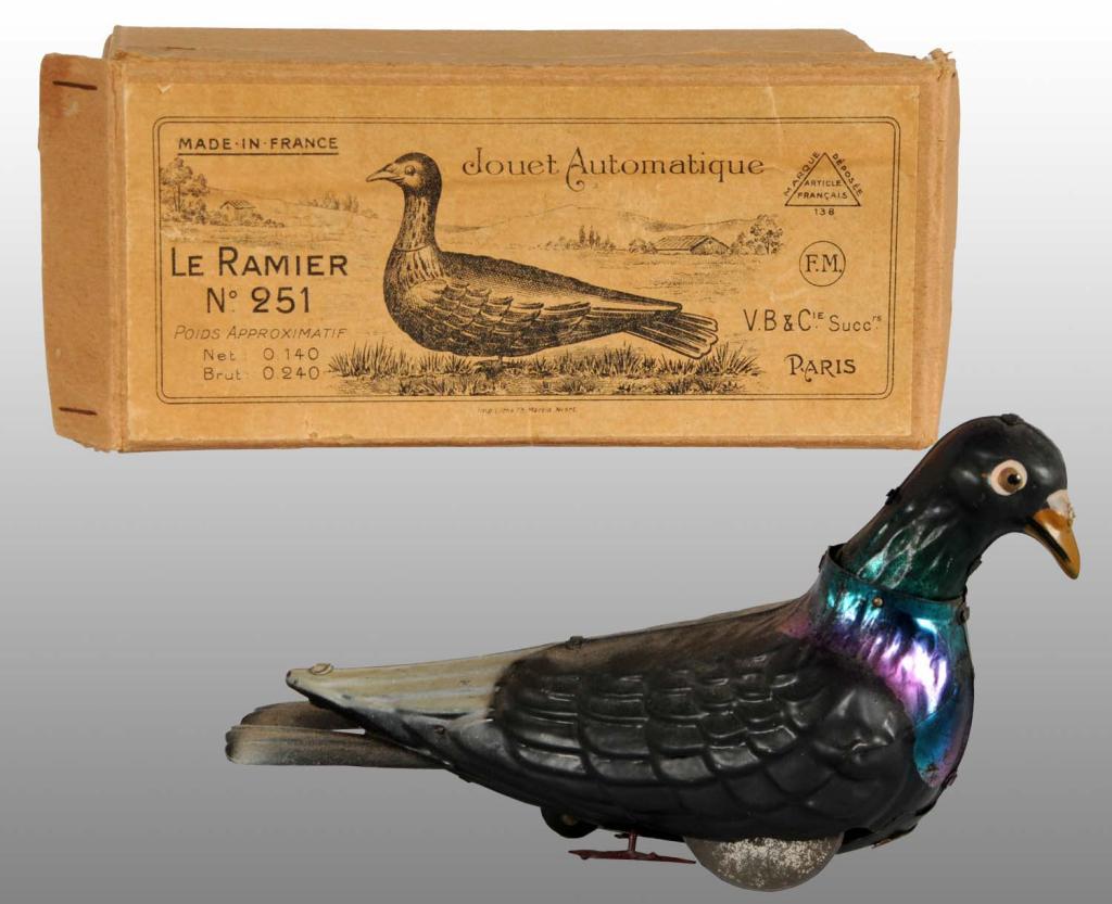Description French. Working. When wound, pigeon rolls and head bobs back and forth. Very nice lithography with metal plate on bottom marked "V.B. & Company, Paris Made in France". Toy has very little wear. Includes original box marked "FM Le Ramier #251". Condition (Excellent - Near Mint). Size 8" L.