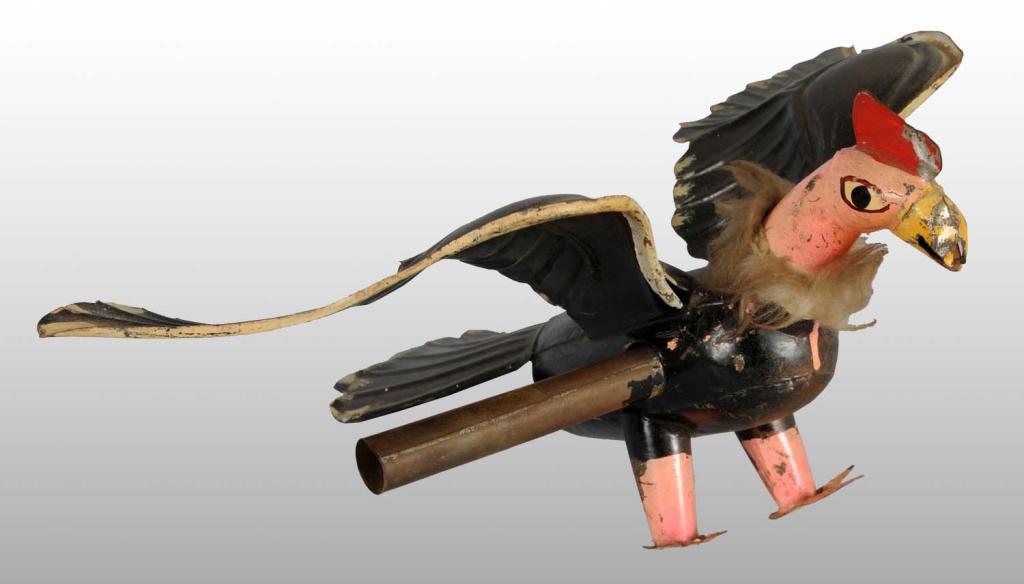 Description Probably American. Very unusual. Head and feet appear to be hand-painted while rest of the vulture looks lithographed. Operated by an unusual, tubular, ratchet mechanism. When turned, vulture emits clicking noise. This toy does not wind up or walk. Condition (Excellent). Size 10" L.