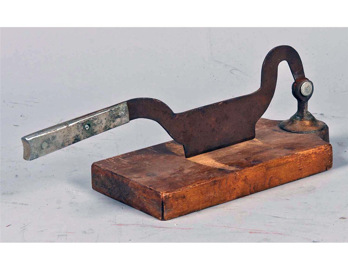With oak block and patinated blade. Maker unknown. Condition (Excellent). Size 5-1/2" x 16-1/2" Including Handle.