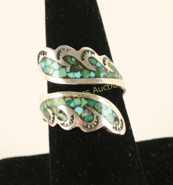 Sterling silver, wrap around style with turquoise chip inlay. Hallmarked S and crescent moon. Size 8. Acid tested to be sterling silver.