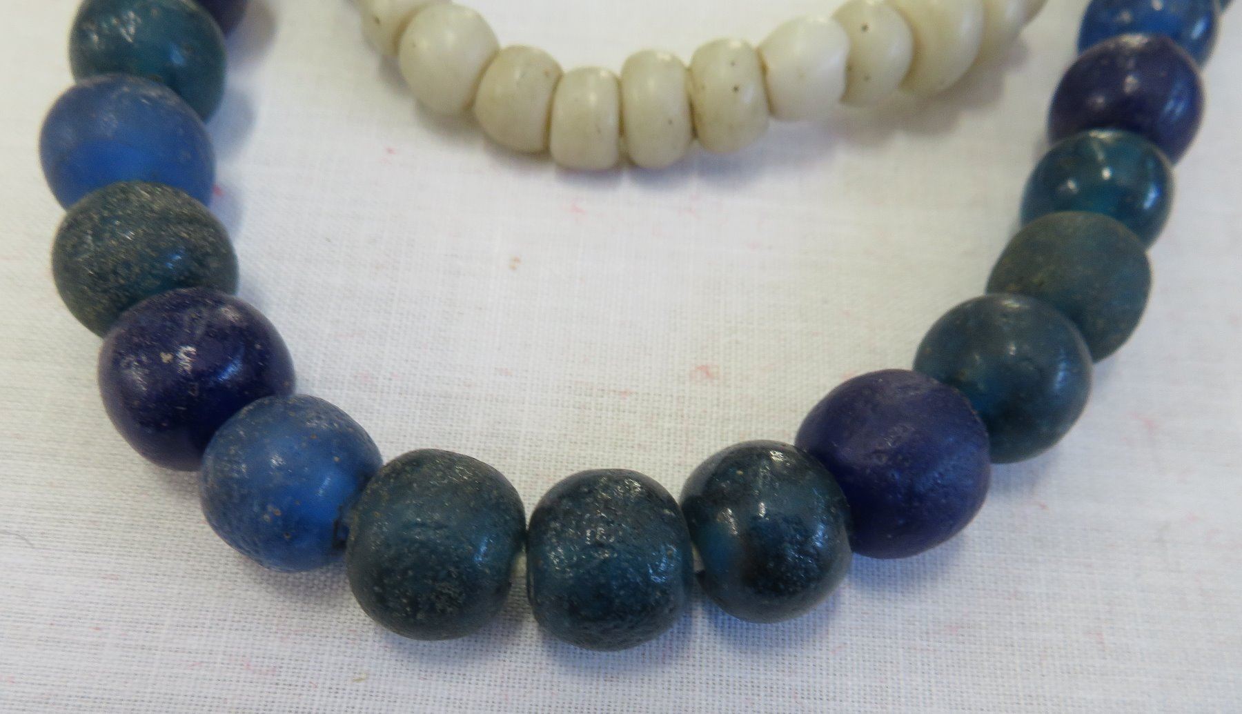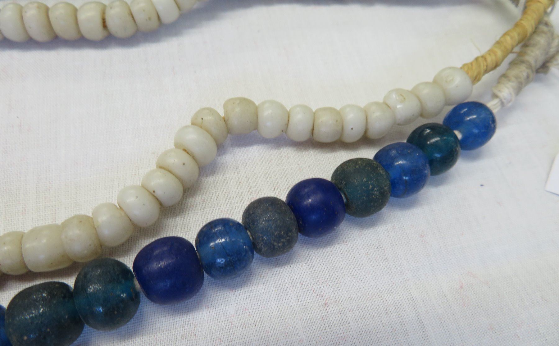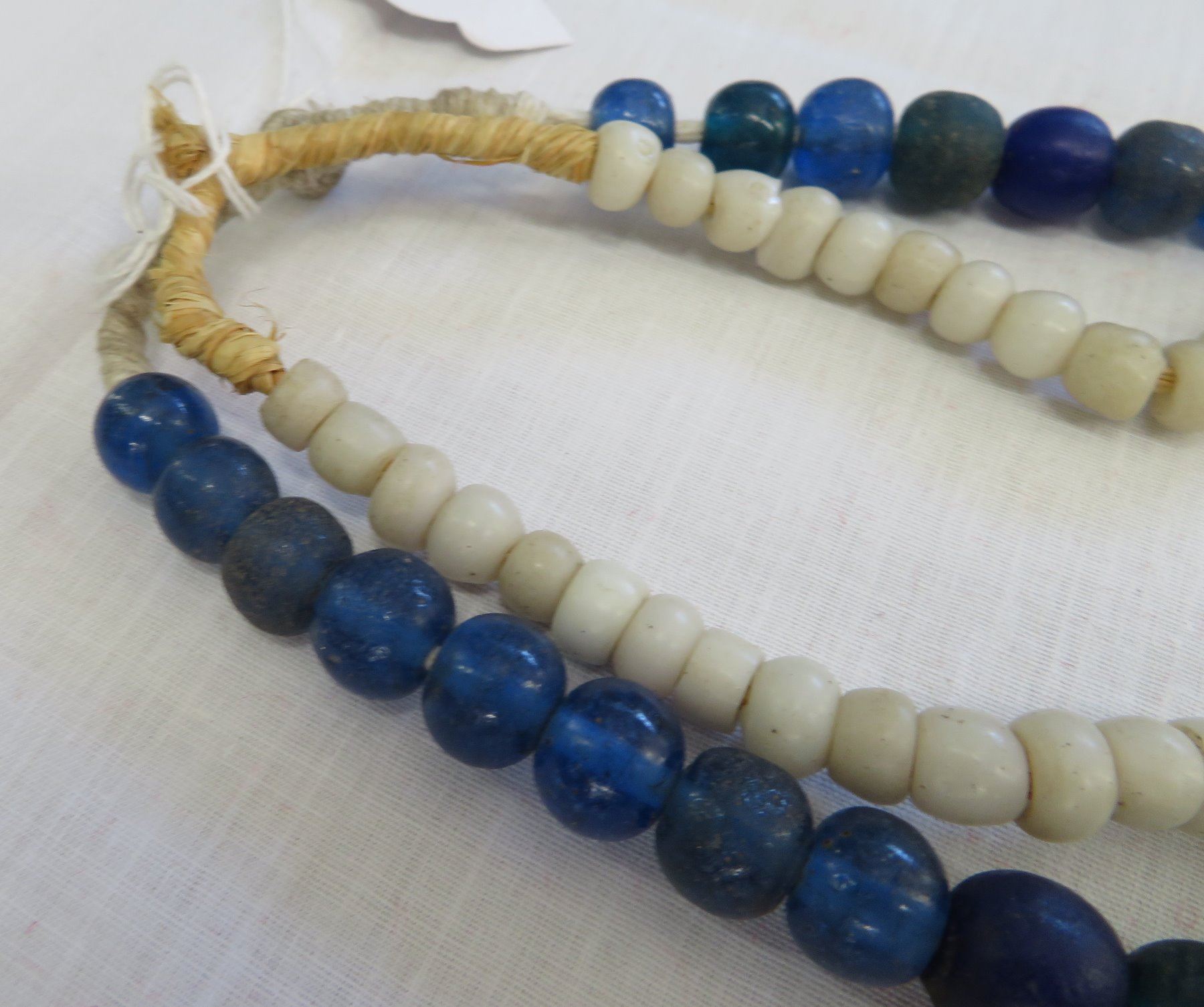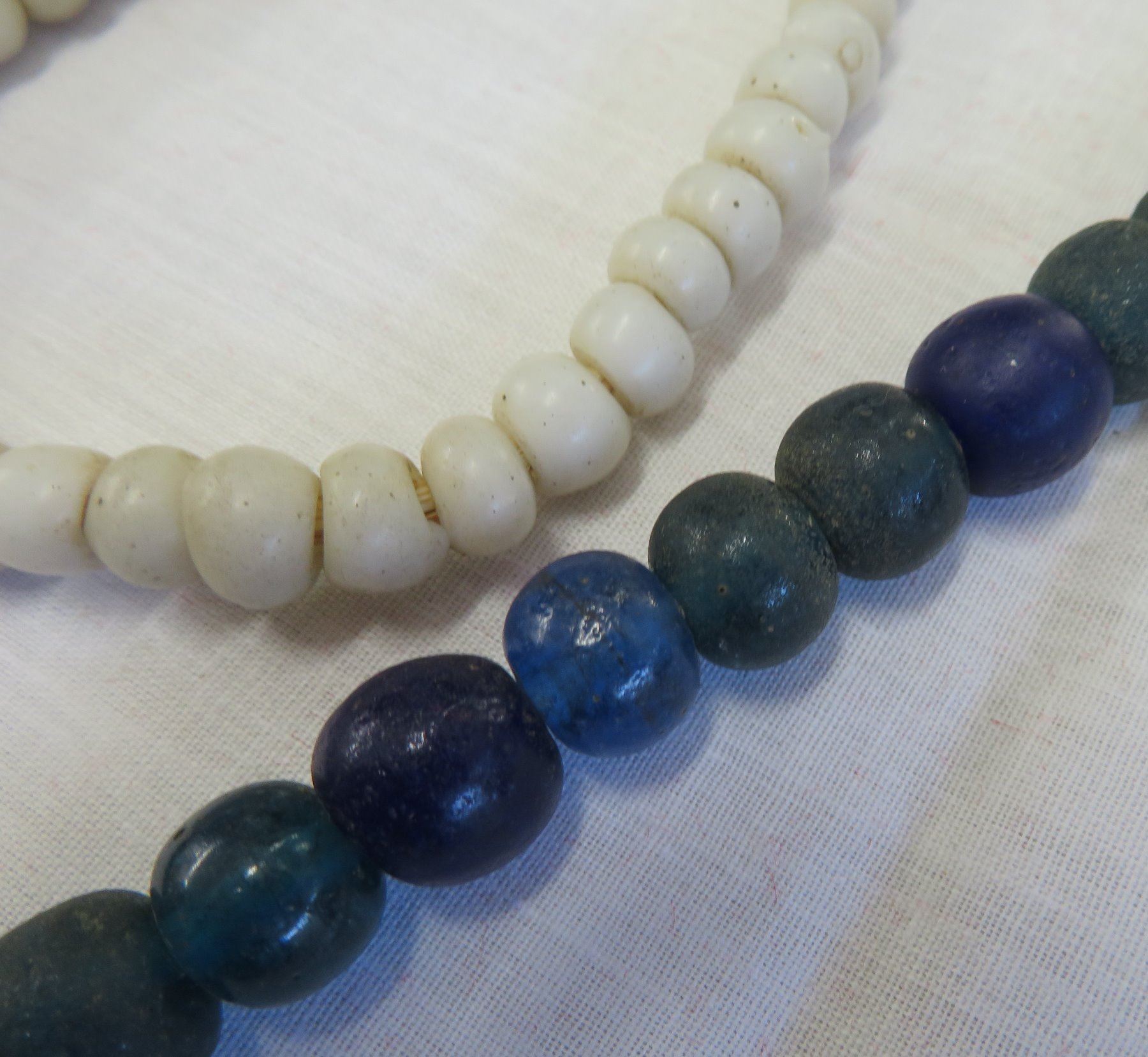 Early Trade Beads, c. 1800s. Made of glass, the items measure 24" to 26" long. Russian, Northwest Coast. Condition: Good, see images. Shipping: $17.50 w/insurance and signature.
