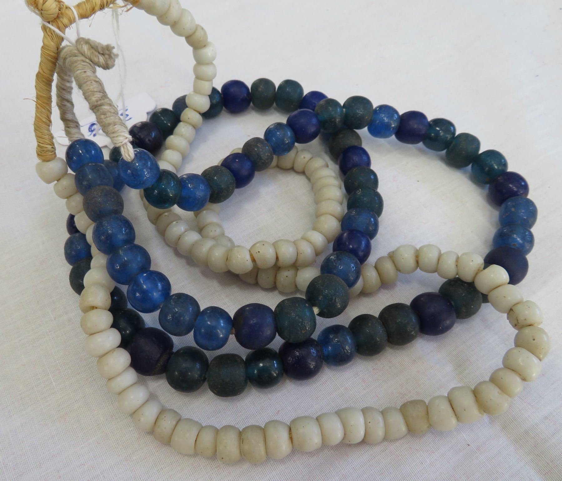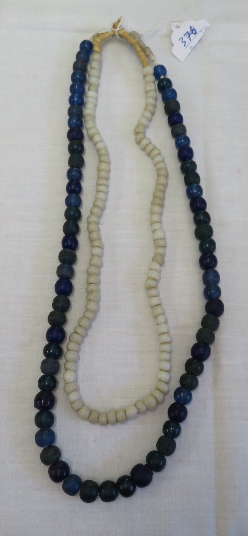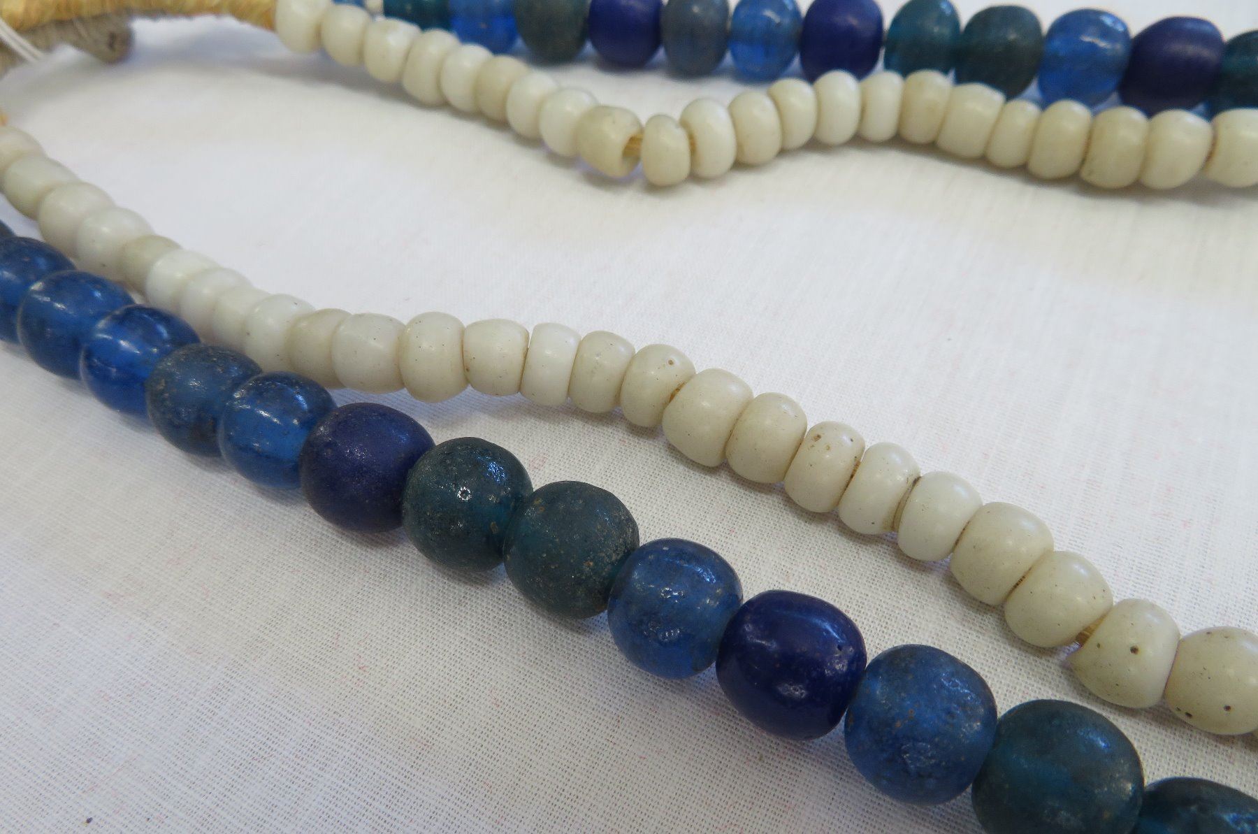 Early Trade Beads, c. 1800s. Made of glass, the items measure 24" to 26" long. Russian, Northwest Coast. Condition: Good, see images. Shipping: $17.50 w/insurance and signature.