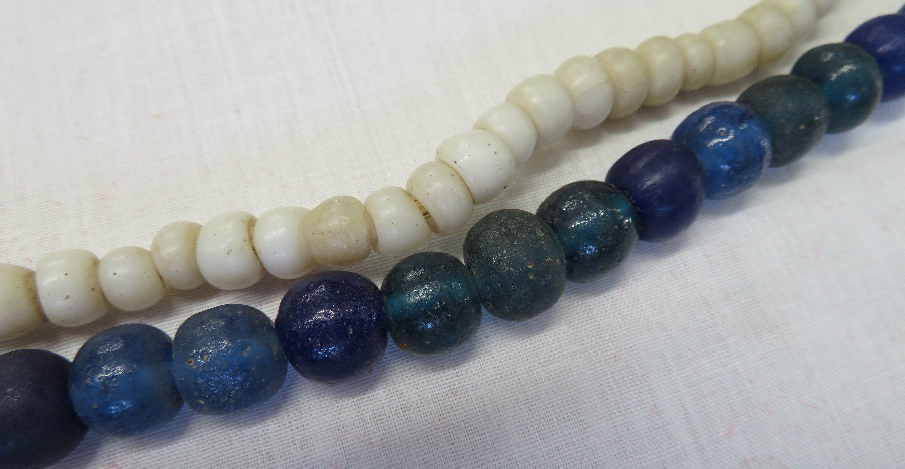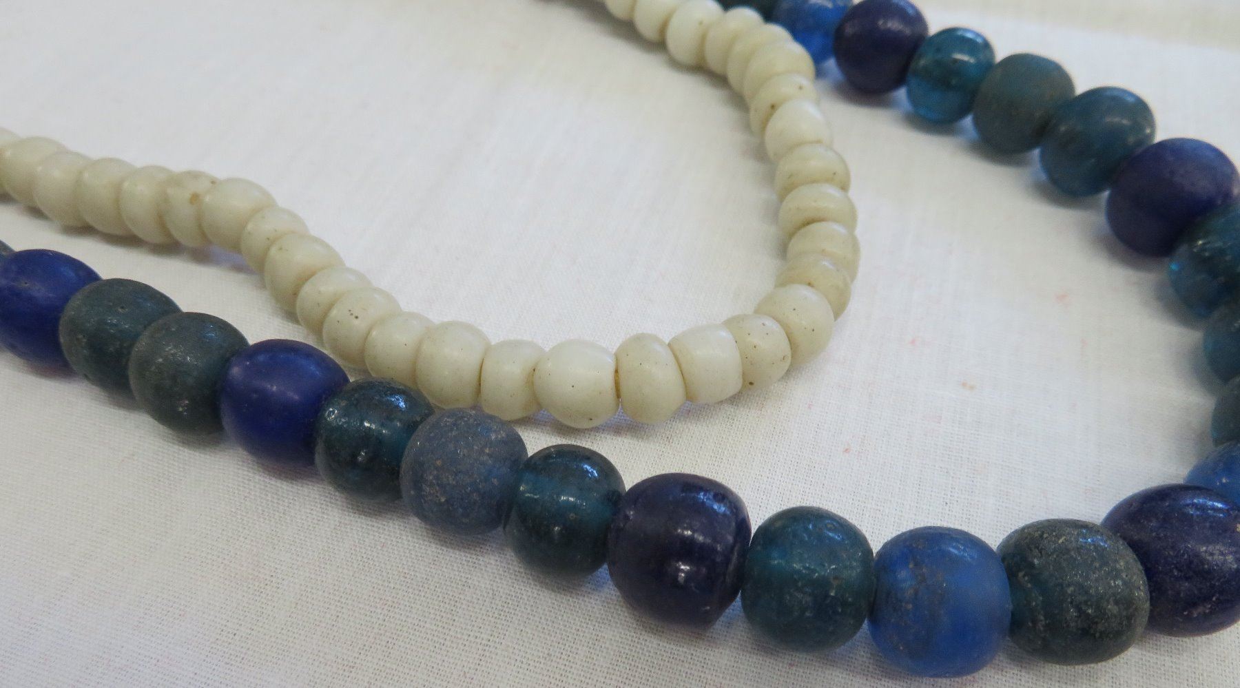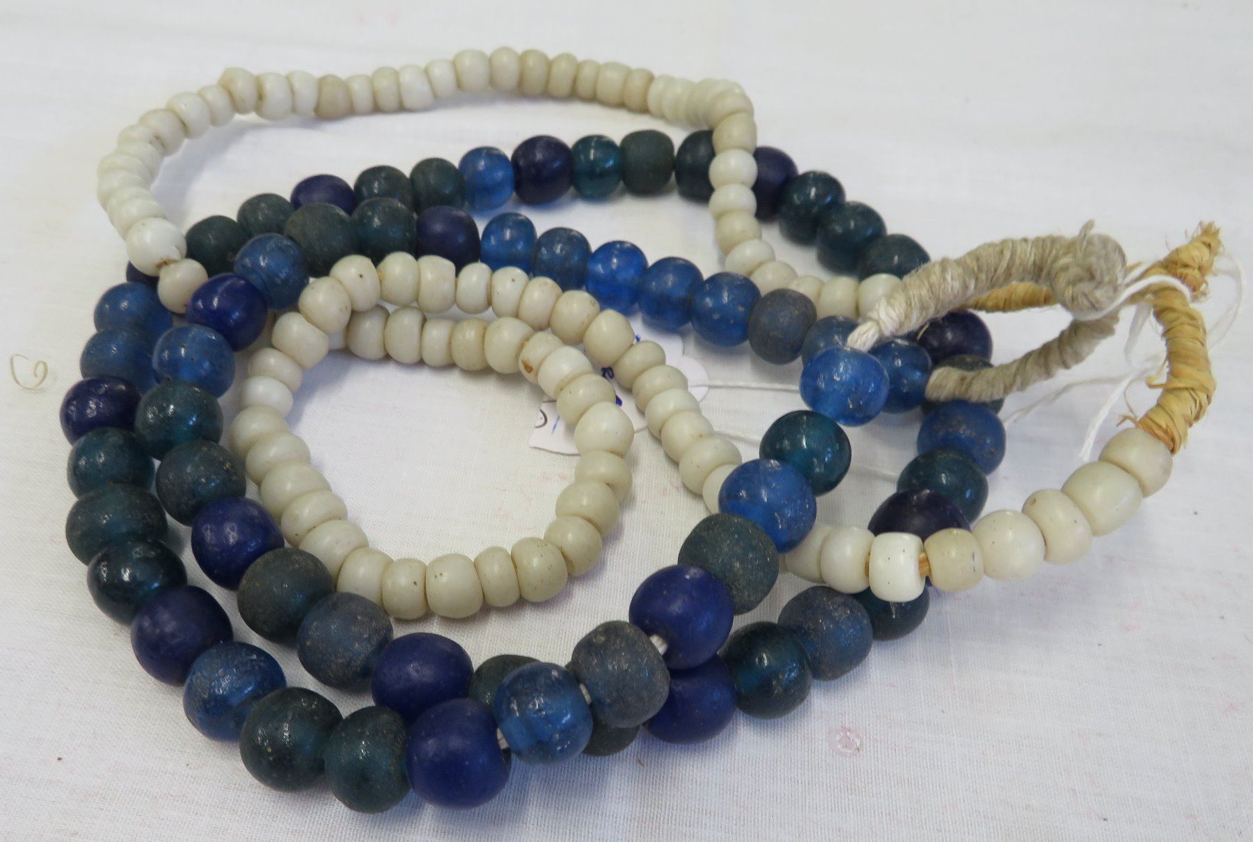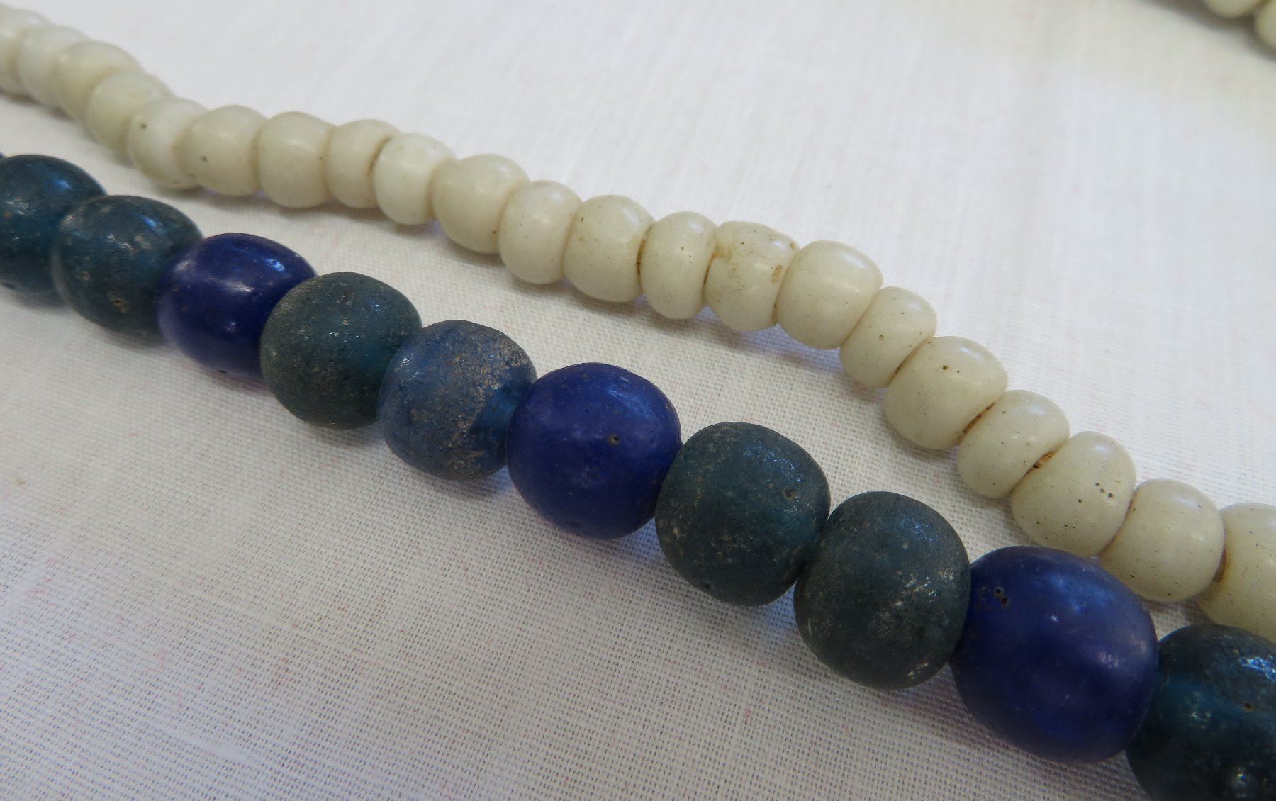 Early Trade Beads, c. 1800s. Made of glass, the items measure 24" to 26" long. Russian, Northwest Coast. Condition: Good, see images. Shipping: $17.50 w/insurance and signature.