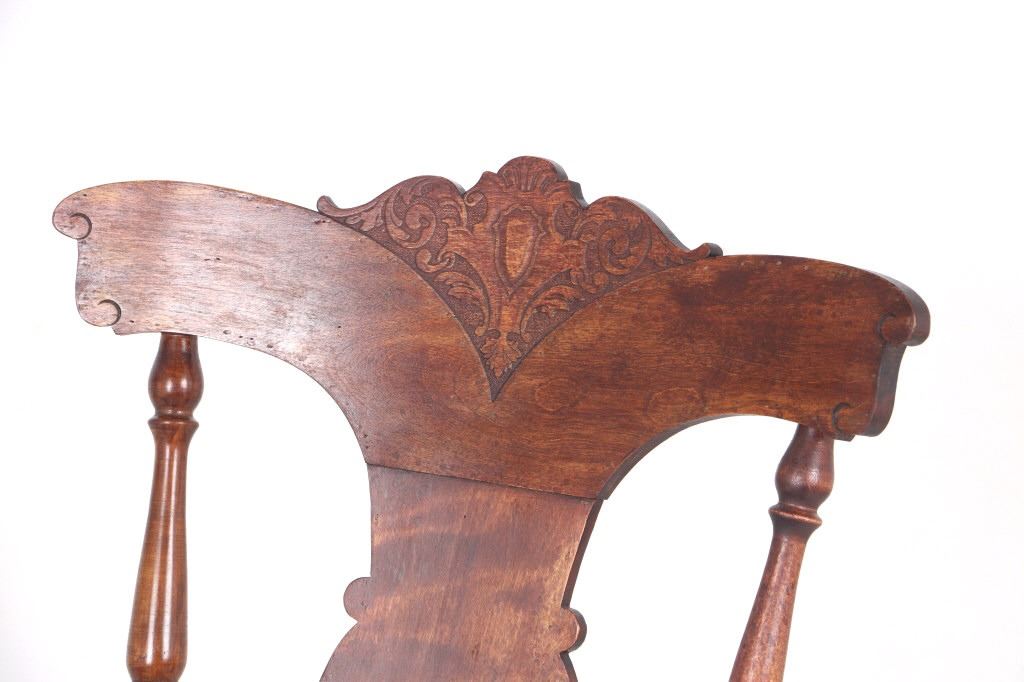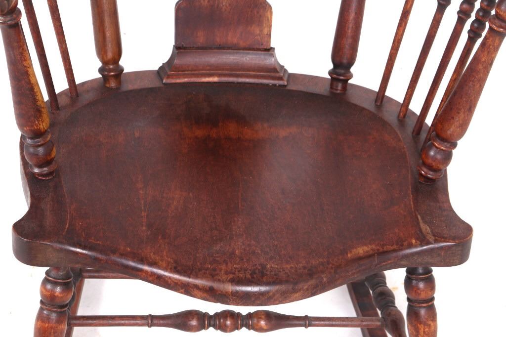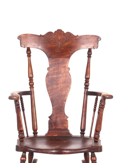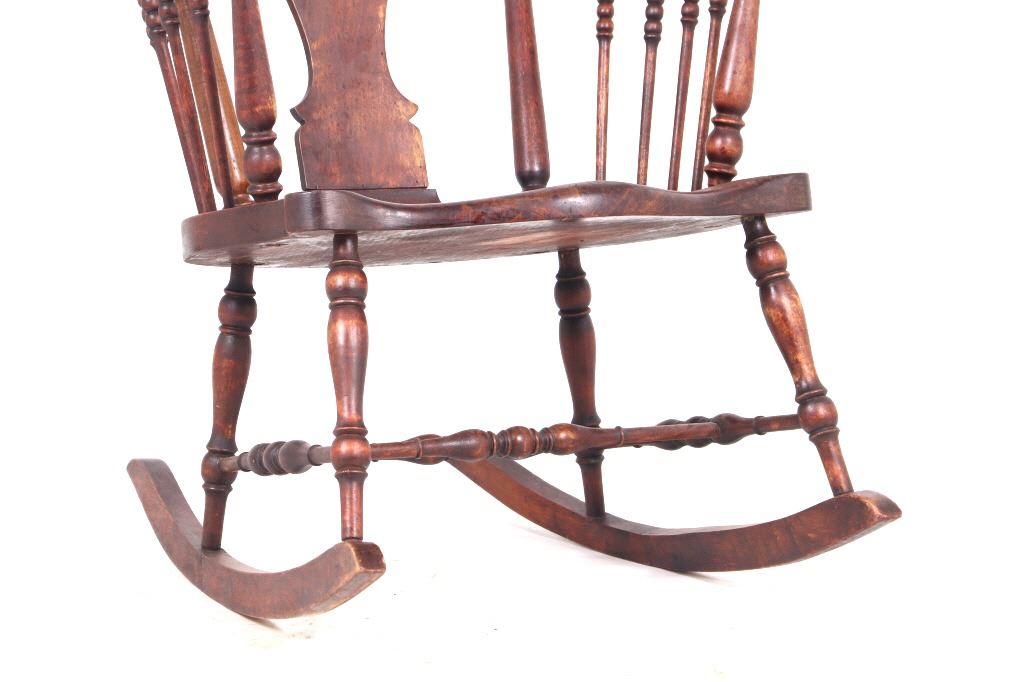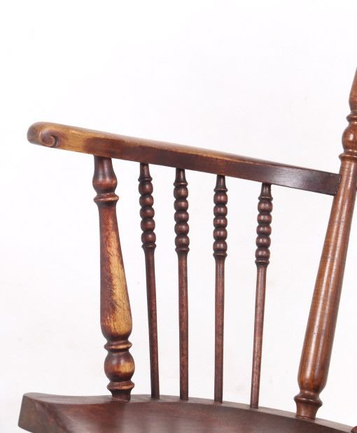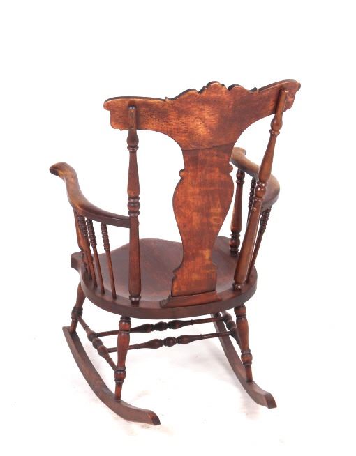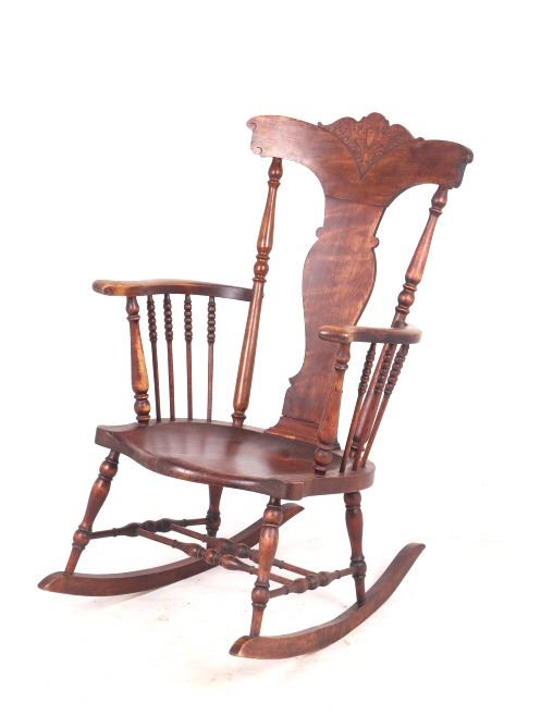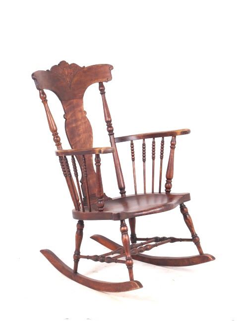For your consideration in this lot is a solid wood antique rocking chair. It features beautifully turned spindles along bottom and under the arm rests. The rocking chair has a contoured seat, and intricate design on the head of the backrest. The chair is in good condition and shows some signs of age and use. It measures approximately 24" wide, 38.5" tall and 15" seat height.