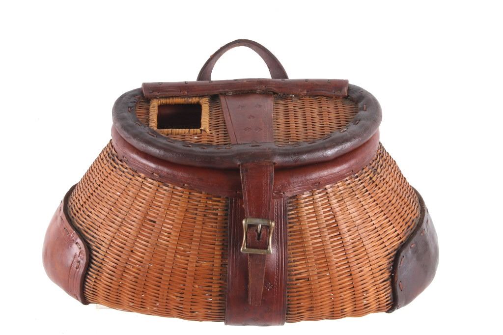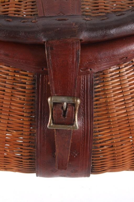 Featured in this lot is a "Turtle" leather & bamboo weave fishing creel from the early-to-mid 20th Century. The "Turtle" creel was a unique Korean creation that used woven bamboo for the basket, as opposed to the typical French Weave or Wicker baskets constructed of willow or rattan by other Asian makers. The creel was finished in leather and has a peculiar bulbous shape due to its turtle-style design. This creel shows a leather and metal buckle to secure the top lid and the fish hold is on the top of the lid. It shows good condition overall with slight wear present from its age and use over the years, but no major signs of damage are noted. The creel measures 7 1/4" L x 16 1/4" W x 8 1/4" H and weighs 1 pound and 14 ounces.*