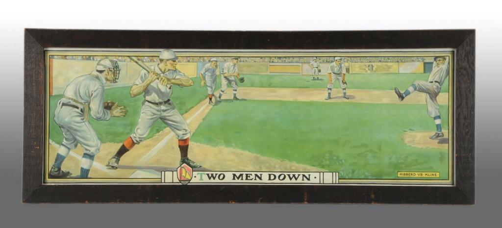 Circa 1920. Wooden frame. Marked "Hibberd VB Kline" on bottom corner. Shows men playing baseball. Interesting and colorful piece. Condition (Very Good - Excellent). Size 18" x 48".