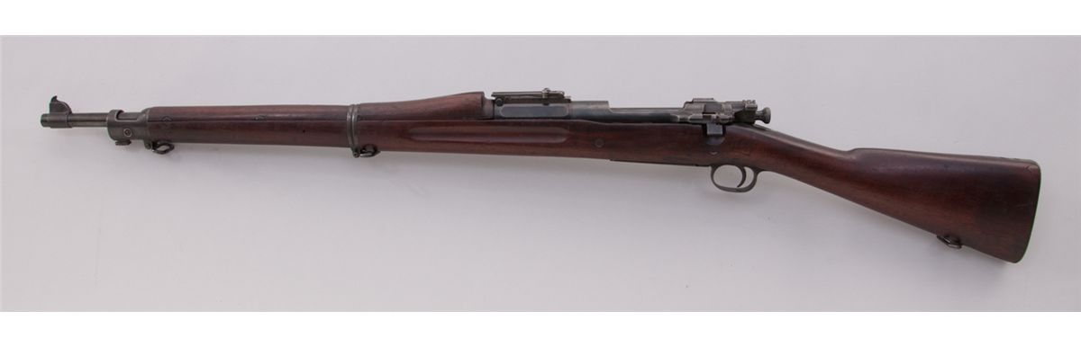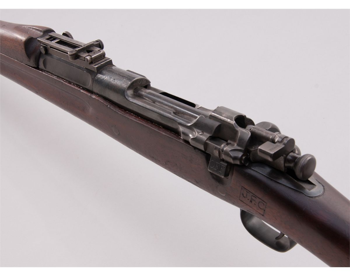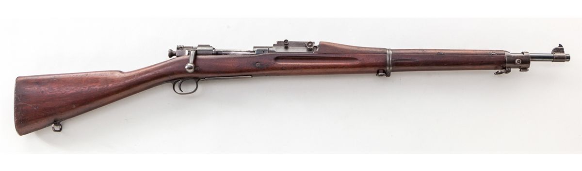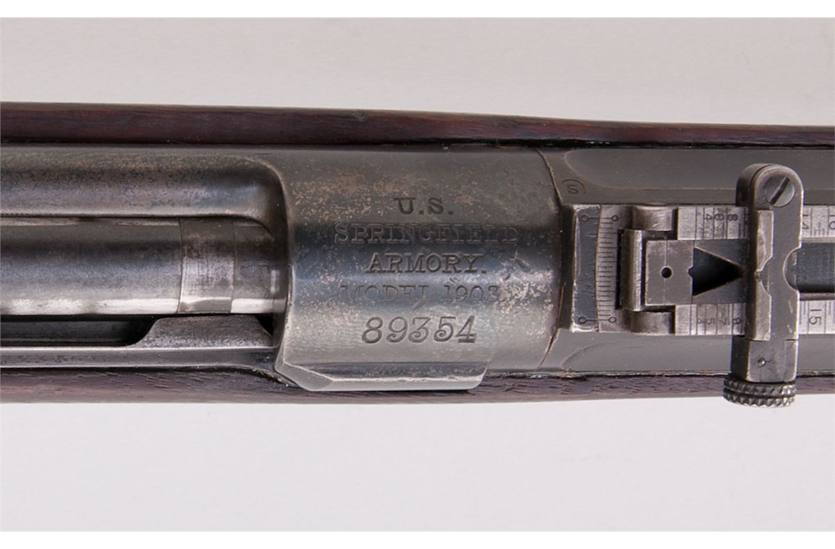 Early U.S. Model 1903 Springfield Bolt Action Rifle, #89354, .30-06 cal., 24'' barrel, early oil-quenched blue finish, barrel marked ''SA/05'', dual crossbolt fingergroove walnut stock, slightly later WWI upper handguard, with early features such as small stacking swivel, smooth steel butt trap, sight calibrated to 2700 yards, with dished adjustment knobs. Originally a rod bayonet rifle converted in 1907. Condition is about fine retaining approx. 92% arsenal blue. Markings to end of barrel are lightly thinned. Cartouche to left side of stock above trigger has been enhanced at one point. Action remains crisp, bore is good. Est.: $1,000-$1,500. (C&R)