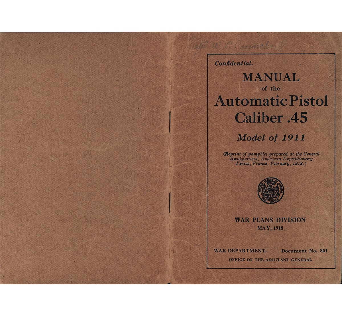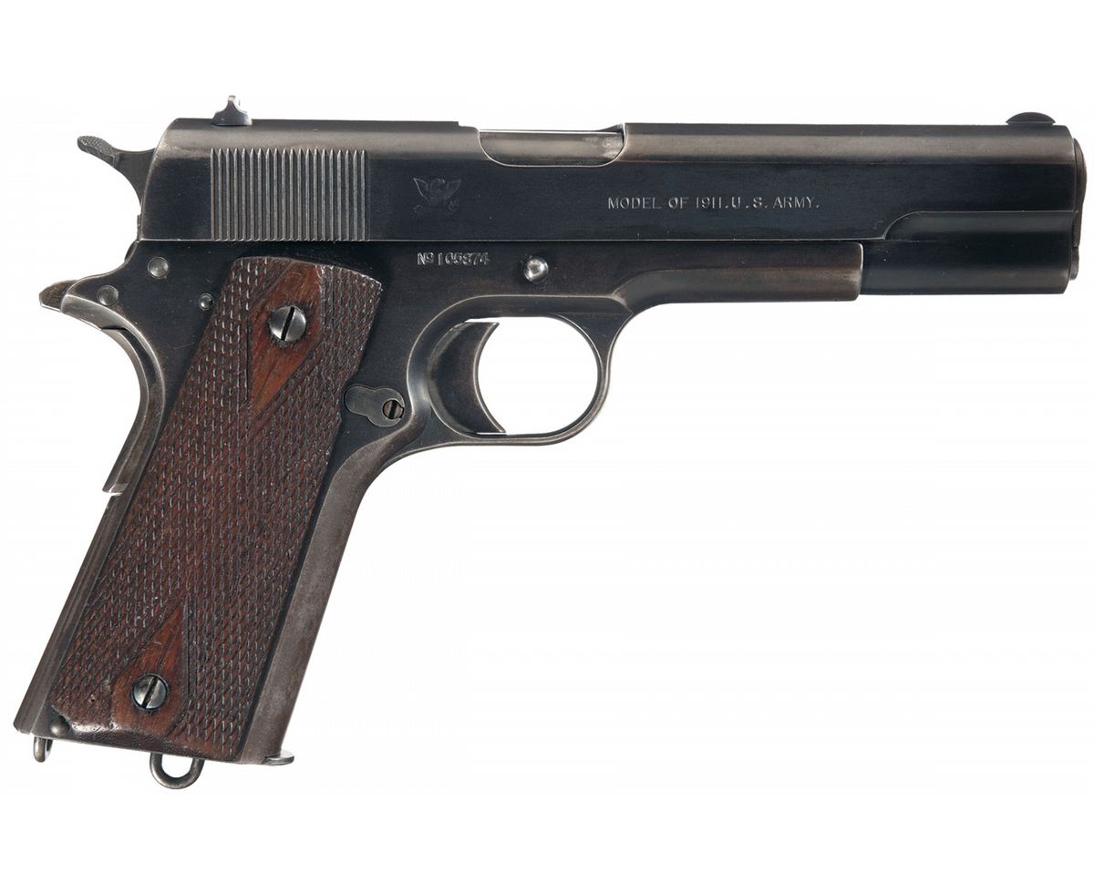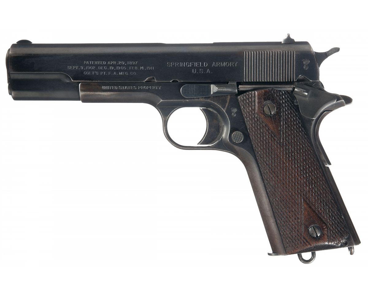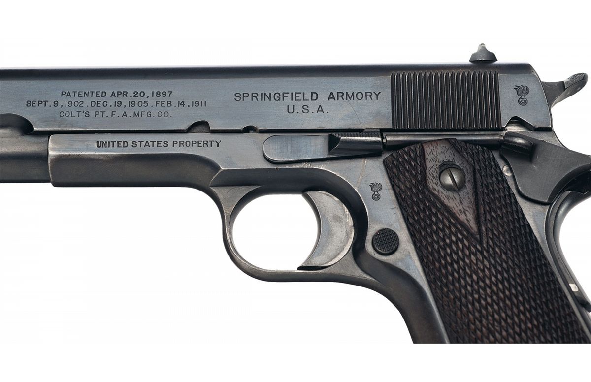 This is a representative example of a U.S. Model 1911 .45 caliber automatic pistol as manufactured by the Springfield Armory in 1914. The Springfield Armory manufactured 27,855 Model 1911 pistols between December 1912 and April 1917 and was the only U.S. Army service pistol ever actually produced within a Government Armory. The front sight is correctly machined as part of the slide and the right side is stamped with the Springfield Armory Spread Wing Eagle/Shield motif followed by "MODEL OF 1911.U.S.ARMY.", the left side is stamped with the three-line Colt patent markings followed by "SPRINGFIELD ARMORY/U.S.A." in two lines, with the Ordnance "Shell and Flame" insignia behind the slide serrations. The right side of the frame is stamped with serial number, "No 105874", behind the slide stop hole; with the left side stamped "UNITED STATES PROPERTY", with the small Ordnance "Shell and Flame" insignia above the magazine release button. The Springfield Armory "S" mark is stamped on the back side of the barrel bushing flange, he inside of the slide stop and on the right side of the hammer. The barrel has a single "P" proof on the right side of the barrel lug and it has the WWI, diamond pattern checkered walnut grips. This scarce pistol is accompanied by an equally scarce Audley Model 1911 leather holster with drop down belt hanger and leg strap. These holster were private purchase and feature a unique, spring loaded catch inside the holster that fits into the trigger guard hole to help secure the pistol inside the holster. The back is marked "AUDLEY/PATENTED/OCT 12. 1914". This pistol lot is complete with two scarce WWI magazines; one original Springfield Armory made magazine with doubles folds on the base plate with the lanyard loop and a second pattern, early Colt, saw cut and punch magazine with the lanyard loop on the bottom, a WWII clear plastic/water proof invasion bag, a copy of an original 1918 dated, Confidential War Plans Division Manual for the Model 1911 pistol, a green zippered plastic storage bag and a black leather, Triple-K double magazine pouch.
