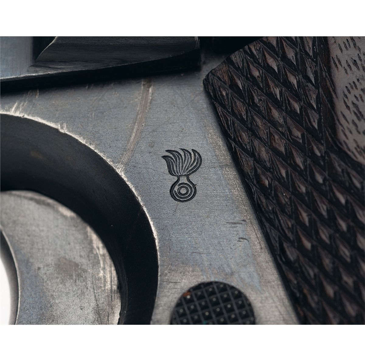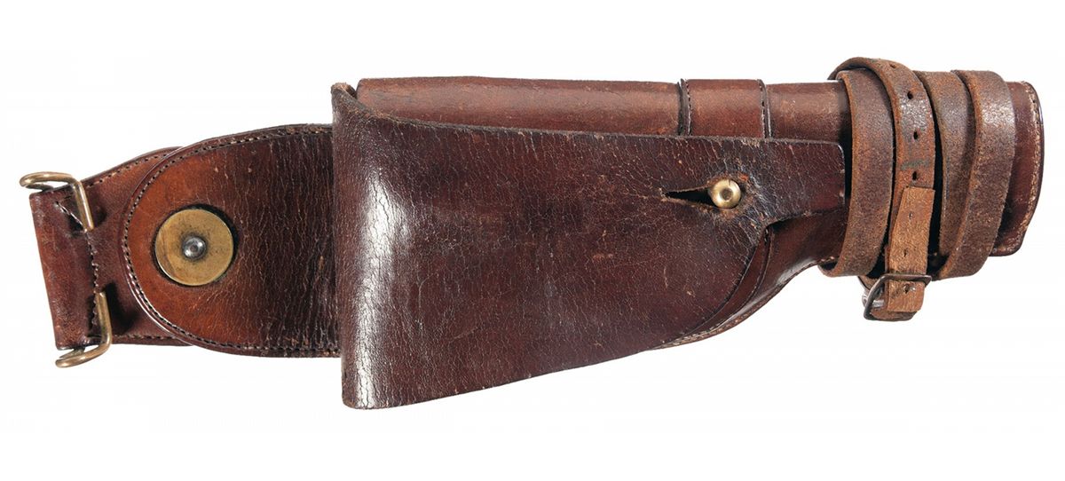 Condition: Fine as partially refinished (cold blue on forward slide and frame) with the balance retaining half of the original armory blued finish remaining overall with even honest wear on all the edges and high spots with the grip straps and front frame extension browning out. The grips are good with distinct checkering and diamonds on both sides, showing even honest wear overall. The Audley holster is very good plus with tight stitching with some wear and minor age cracking on the flap, with some scuffs overall. The various accessories are all very good, with the magazine being refinished.